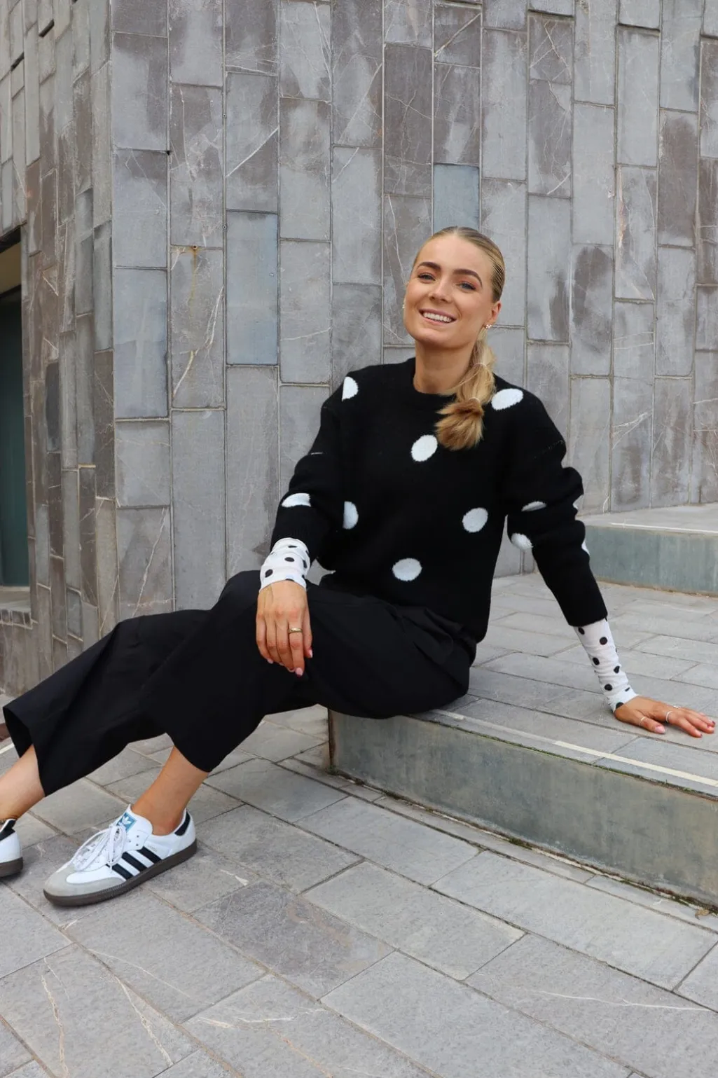 Sort pullover fra Liberte med hvide prikker. Pulloveren har en rund halsudskæring, lange ærmer og en løs pasform.