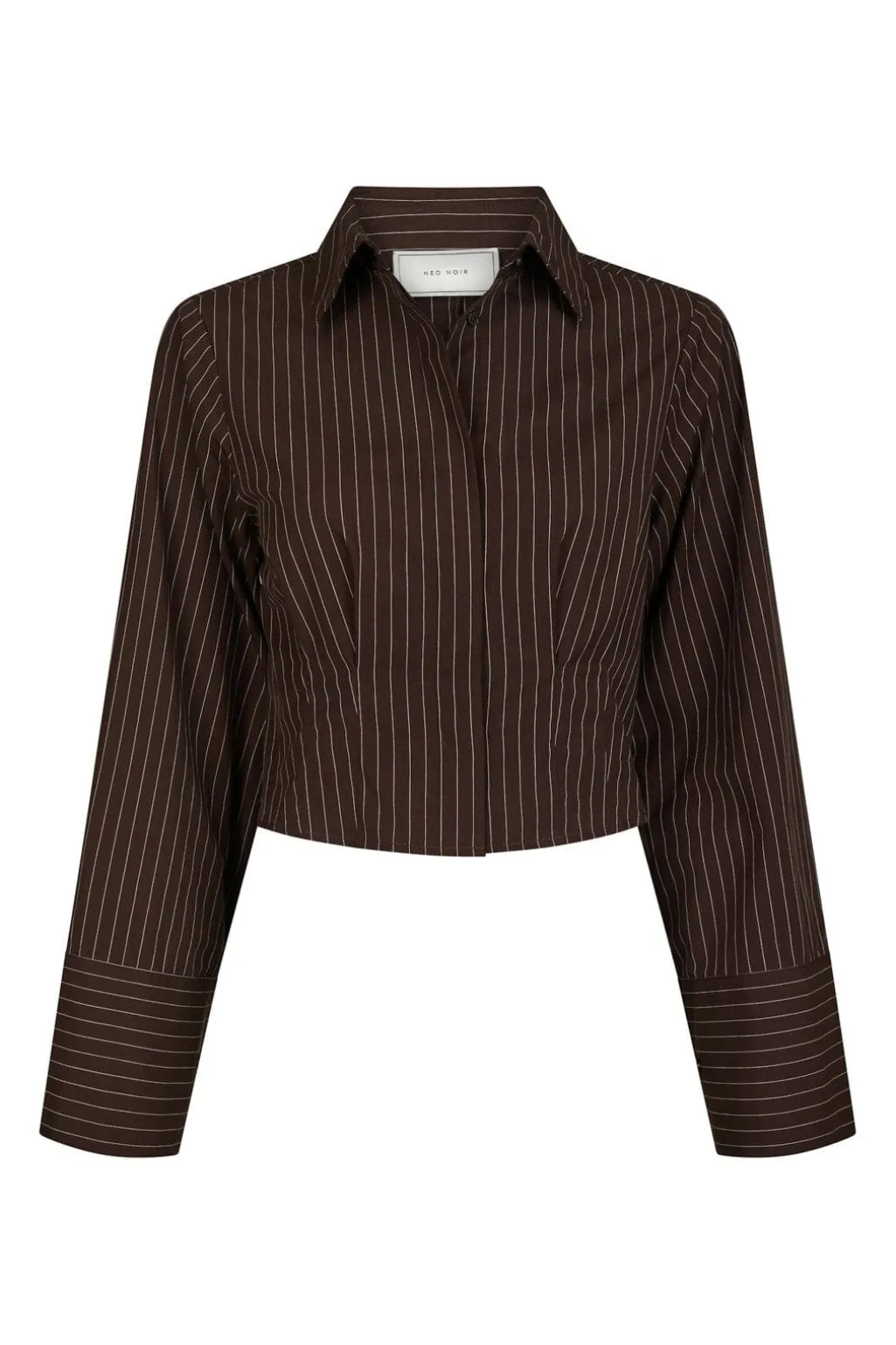 Mørkebrun skjorte fra Neo Noir med lodrette striber. Skjorten har en kort, cropped længde og brede ærmer med manchetter. Den klassiske skjortekrave og knaplukning giver et rent udtryk.