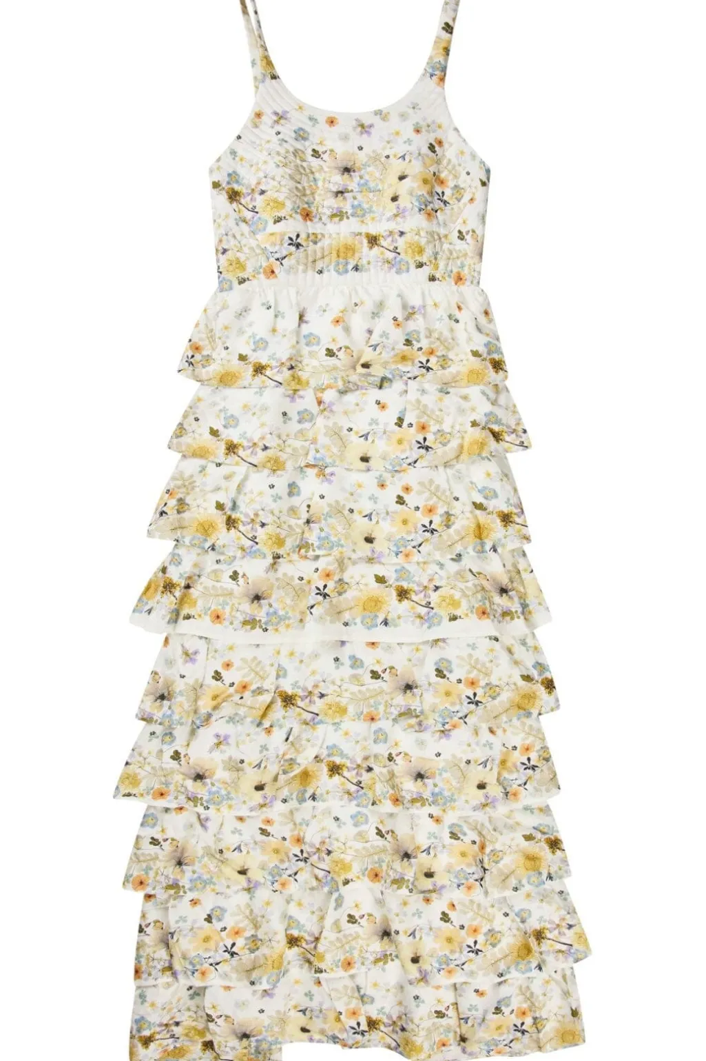 Lang kjole fra Munthe med blomsterprint i gule og blå nuancer på cremefarvet baggrund. Kjolen har smockede detaljer ved brystet og tynde stropper.