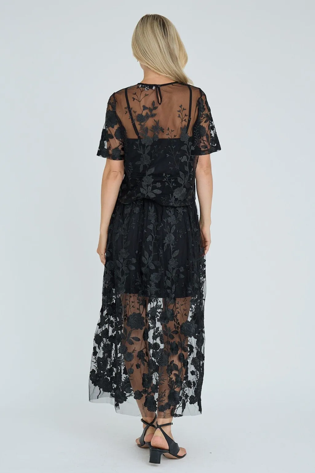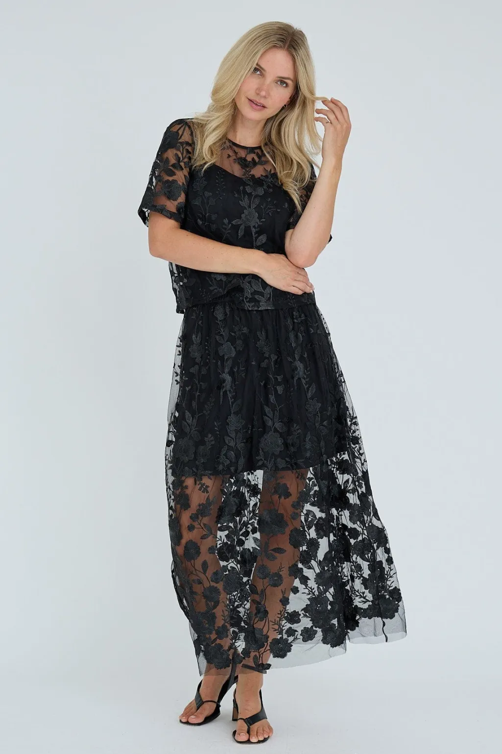 Lang sort nederdel fra A-View lavet af gennemsigtig mesh med broderet blomstermønster. Nederdelen har elastisk talje og kommer med en kortere undernederdel.