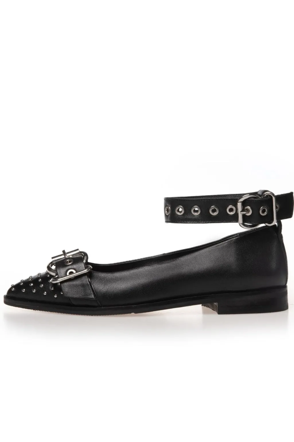 Sorte ballerinaer fra Copenhagen Shoes med spids tå og nitter. Skoene har en ankelrem med spænde og er lavet af læder. De kombinerer et klassisk design med rå detaljer.