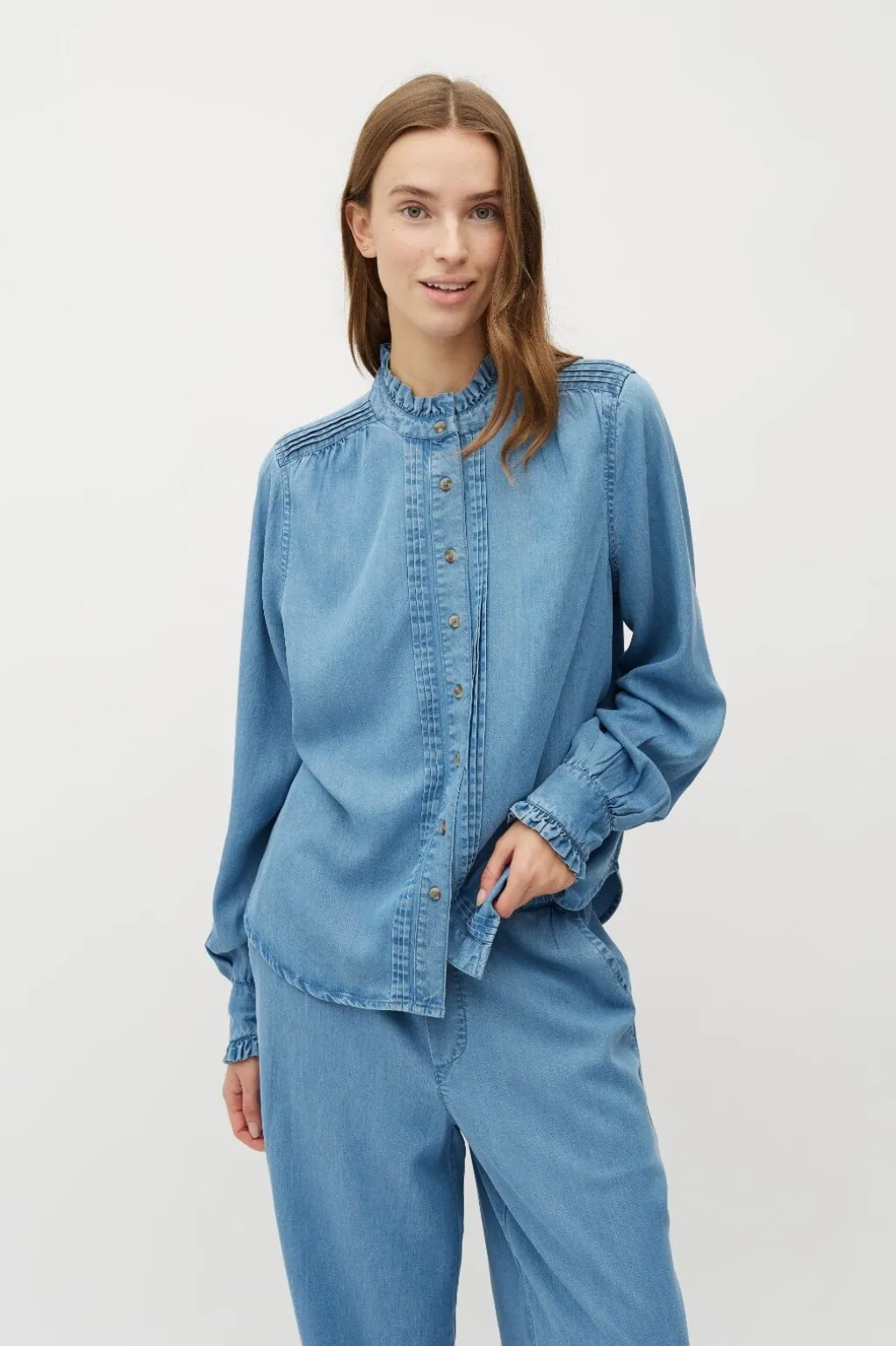 Lyseblå bluse fra MbyM med rynkede detaljer ved kraven og manchetterne. Blusen har en høj hals og lukkes med knapper foran.