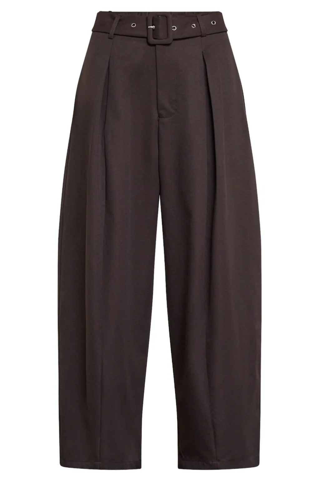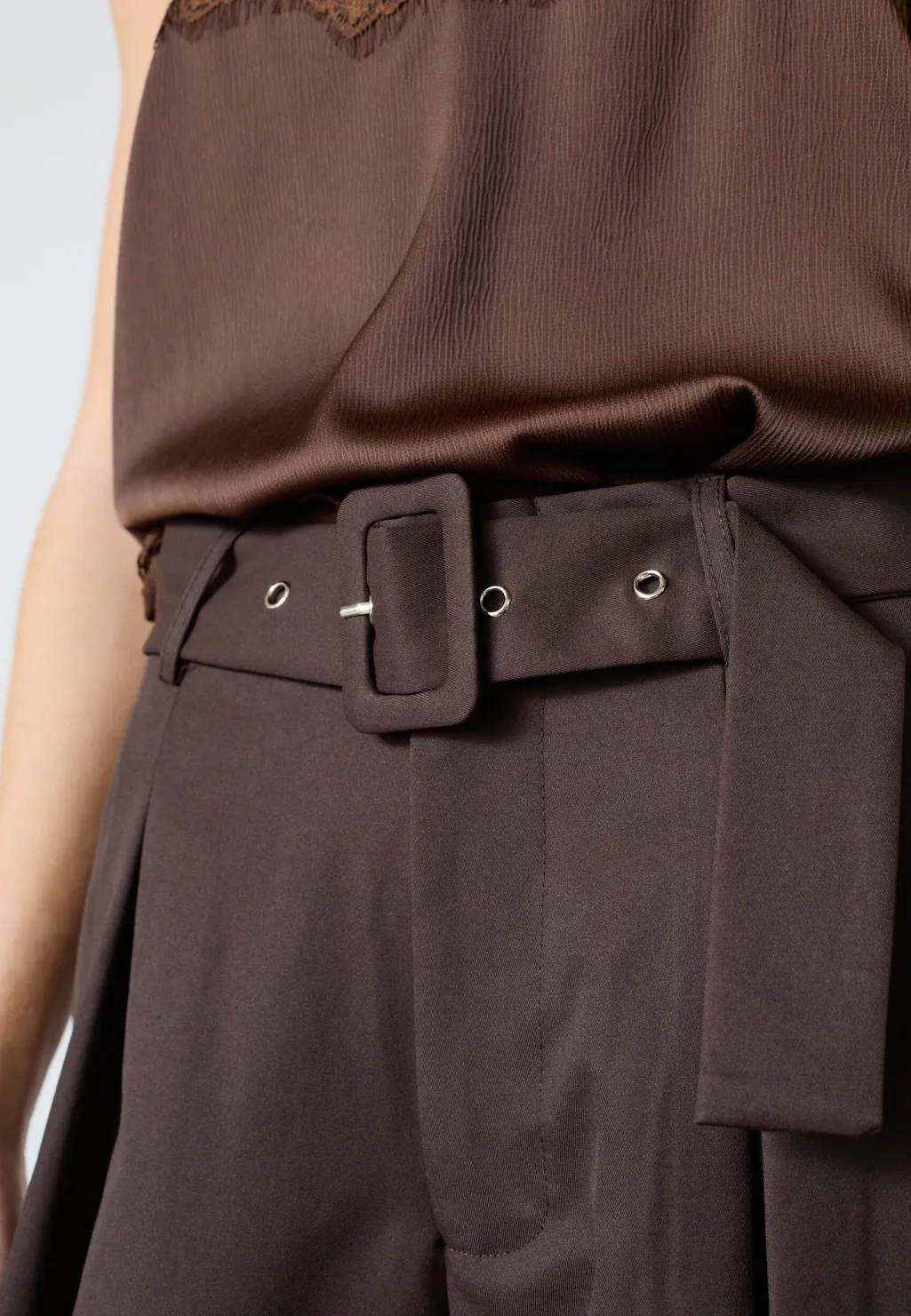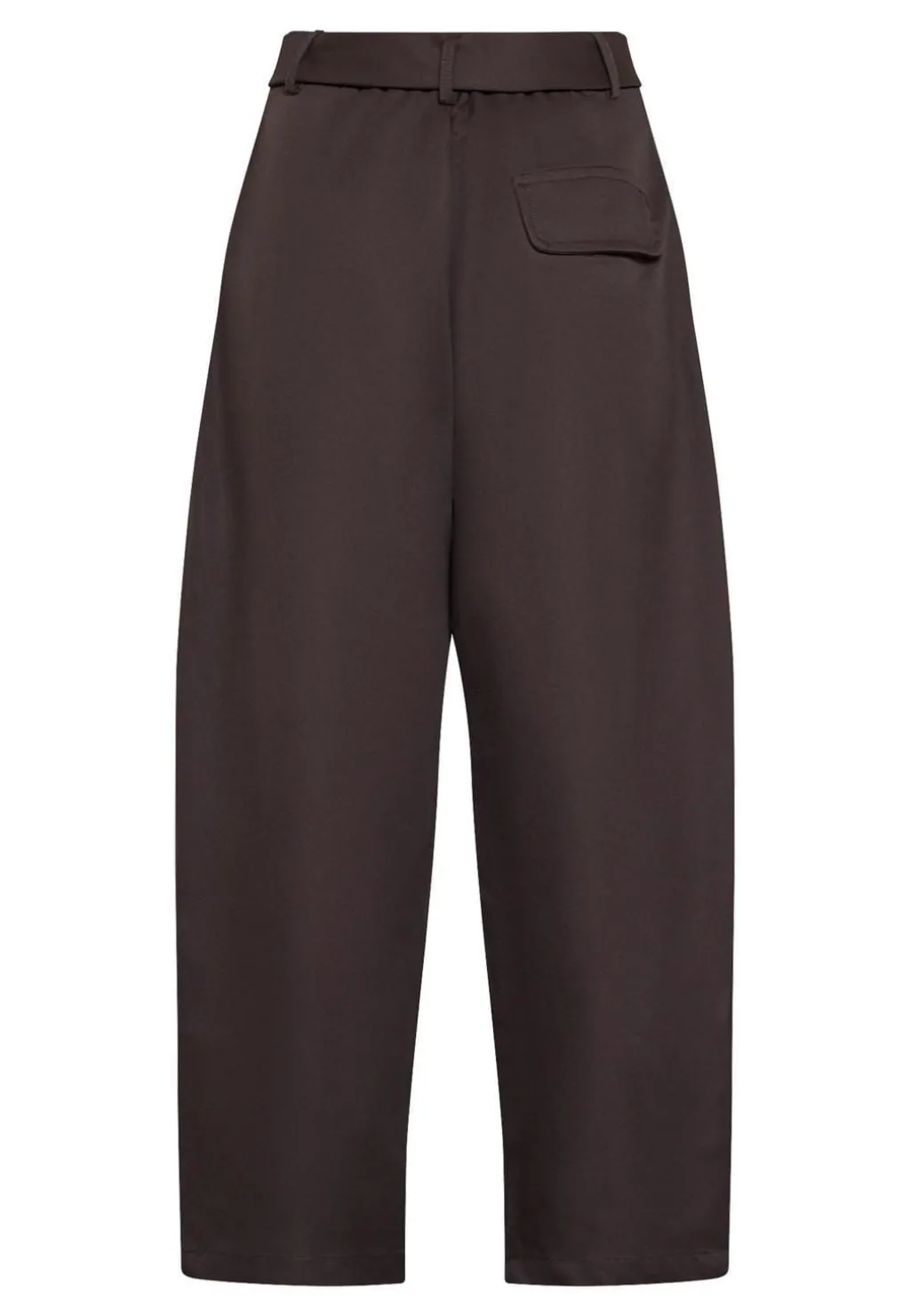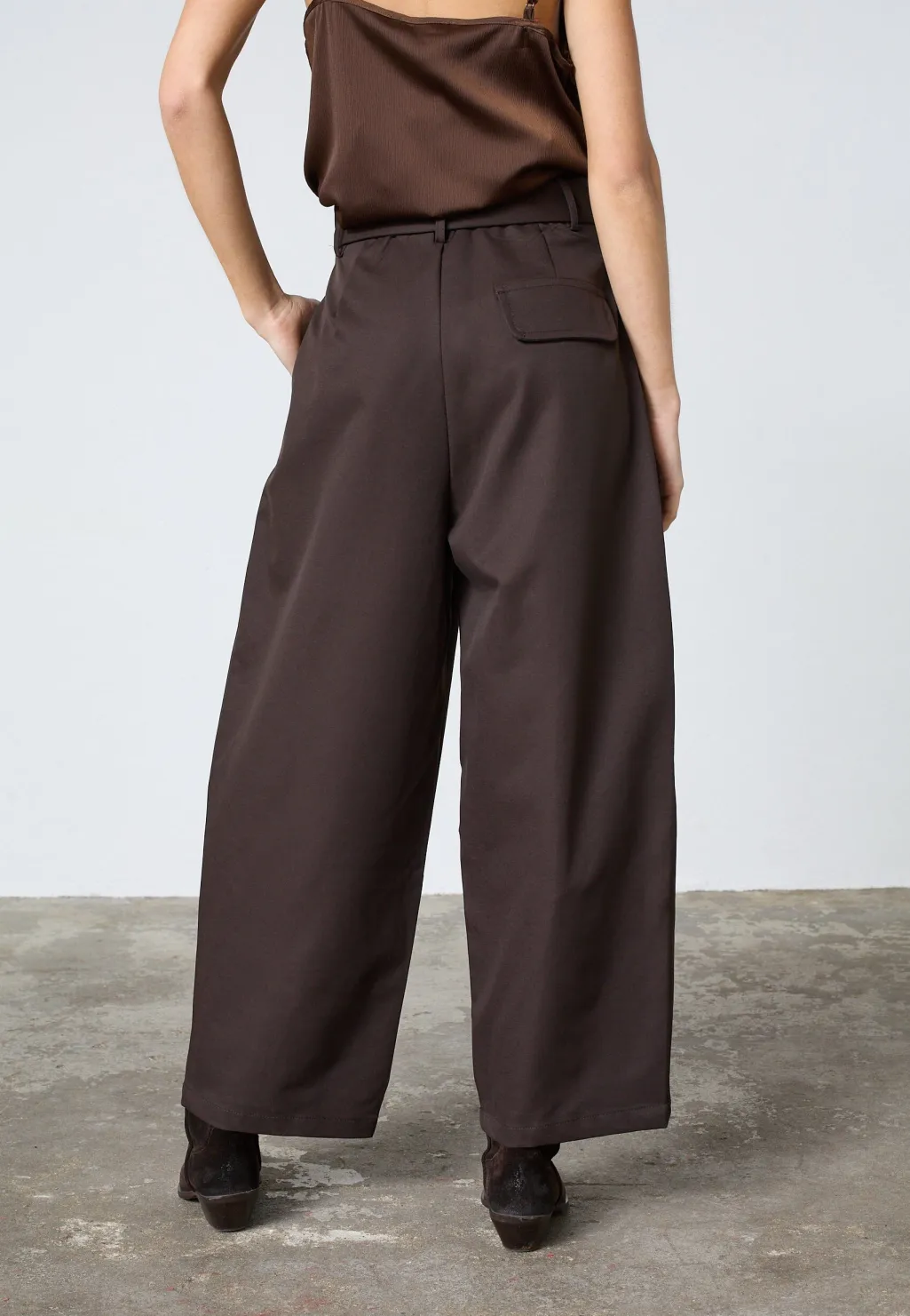 Mørkebrune bukser fra Sisters Point med høj talje og løs pasform. Bukserne har lange, lige ben og en bred, elastisk linning med bindebånd.