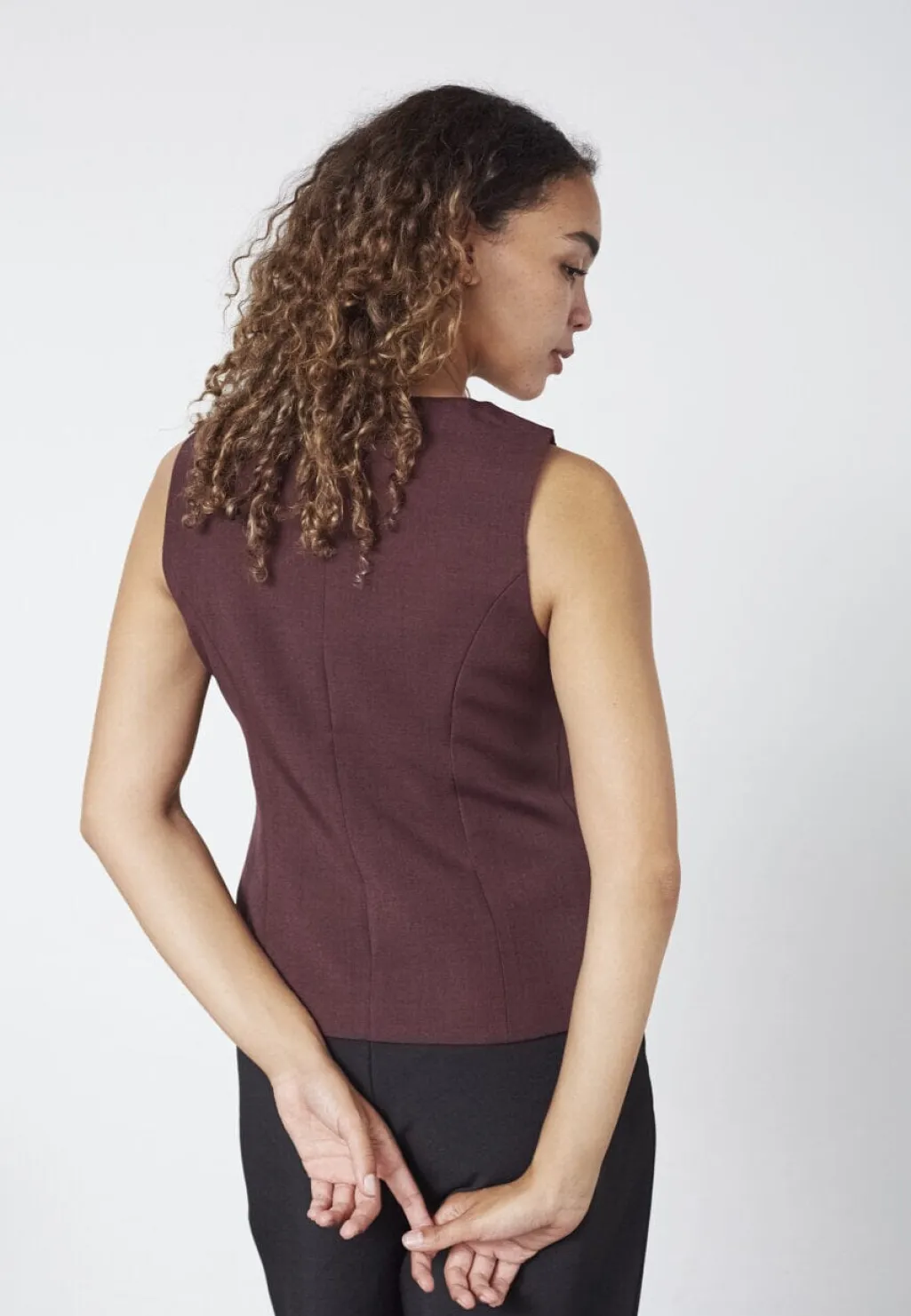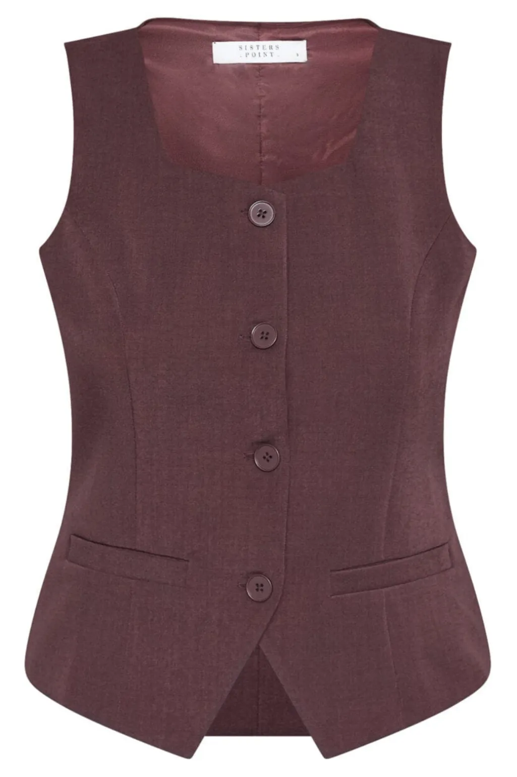 En ærmeløs vest fra Sisters Point i dyb bordeaux. Vesten har en slim fit-pasform og en firkantet halsudskæring med knaplukning foran.