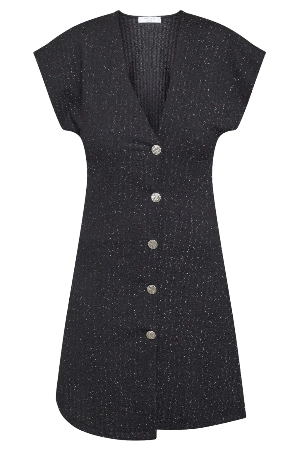 Sort kjole fra Sisters Point med sølvglimmerdetaljer. Kjolen har en dyb V-udskæring og korte ærmer. Dekorative knapper pryder fronten.