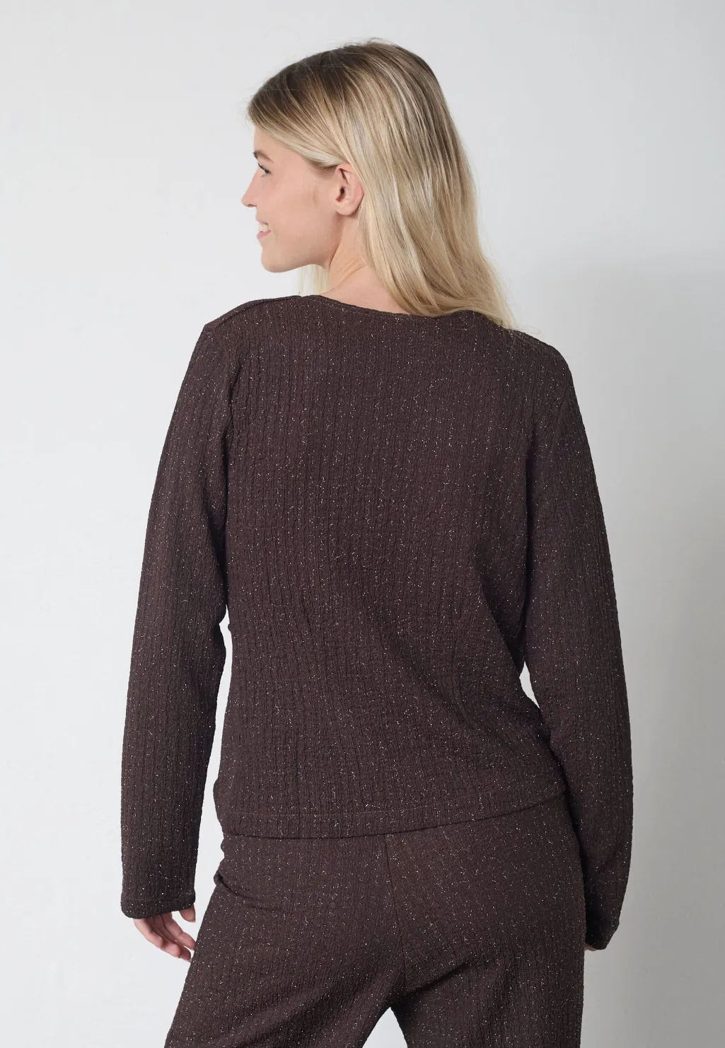 Brun bluse fra Sisters Point med sølvskinnende detaljer. Blusen har lange ærmer, v-halsudskæring og et asymmetrisk design med knaplukning.
