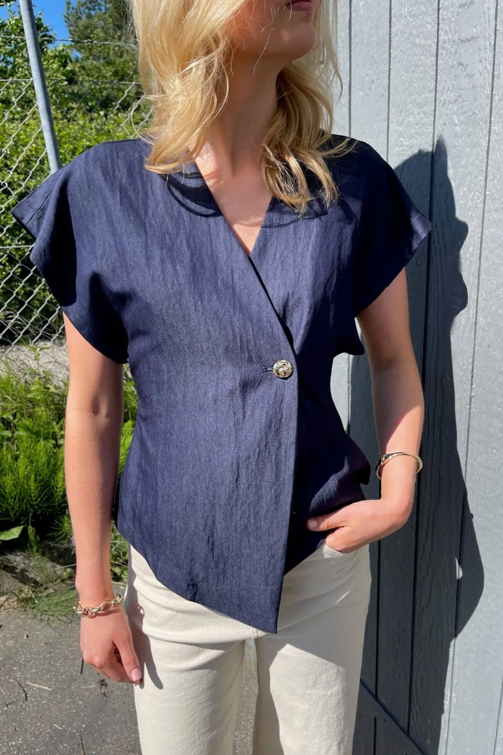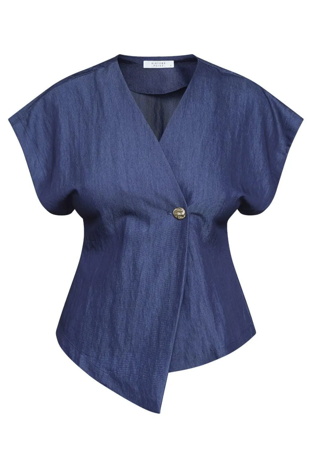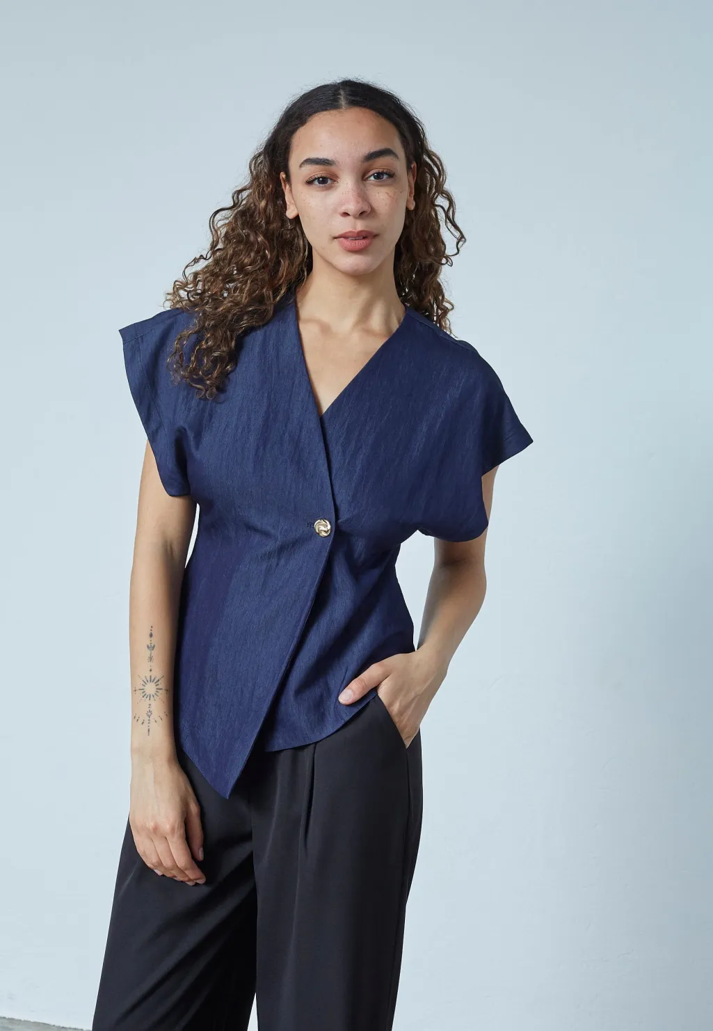 er en elegant vest med et asymmetrisk snit og en v-udskæring. Vesten har brede skuldre og en enkelt knaplukning, der skaber en moderne og unik stil. Modellen har en str. S på. Obs. lille i str. vi anbefaler derfor at gå én str. op