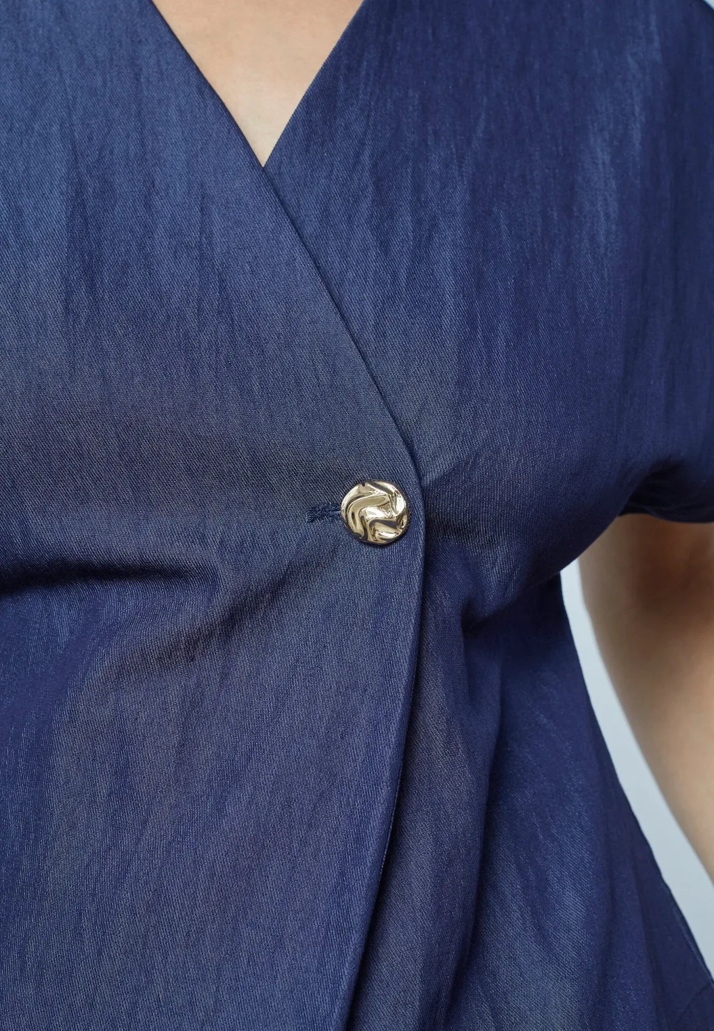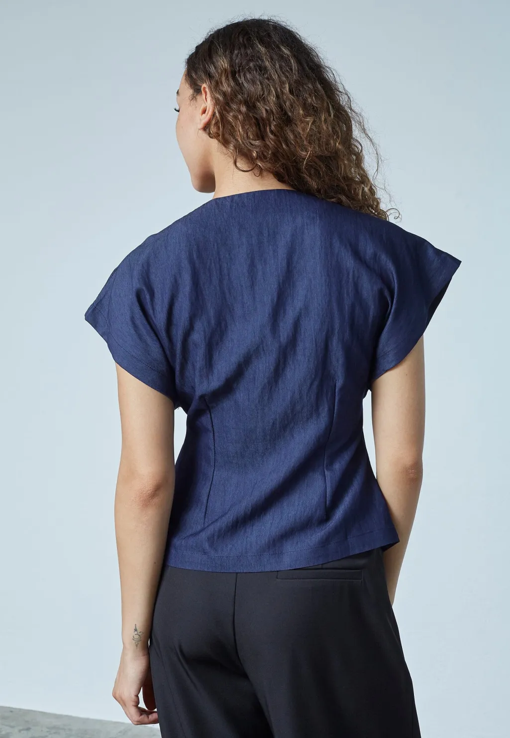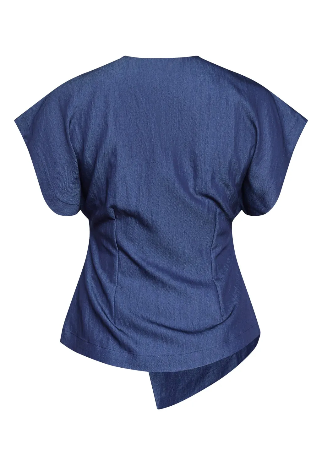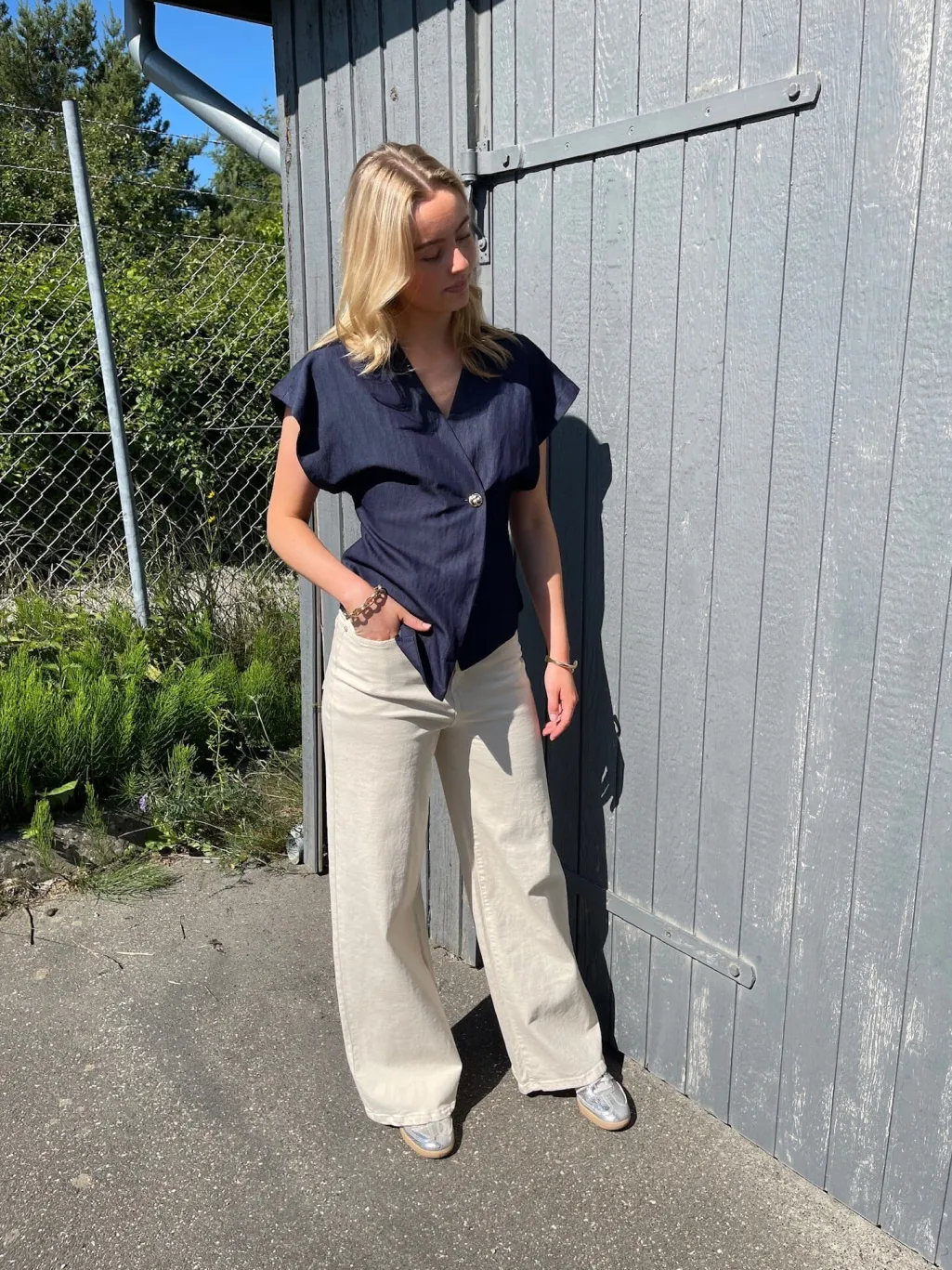 er en elegant vest med et asymmetrisk snit og en v-udskæring. Vesten har brede skuldre og en enkelt knaplukning, der skaber en moderne og unik stil. Modellen har en str. S på. Obs. lille i str. vi anbefaler derfor at gå én str. op