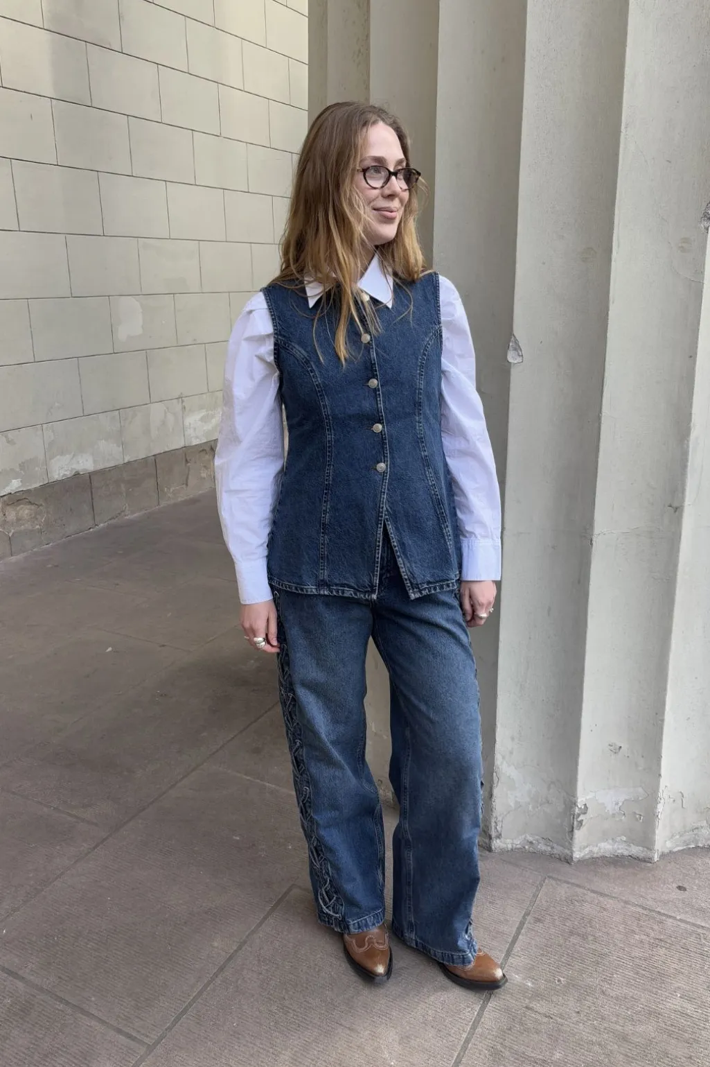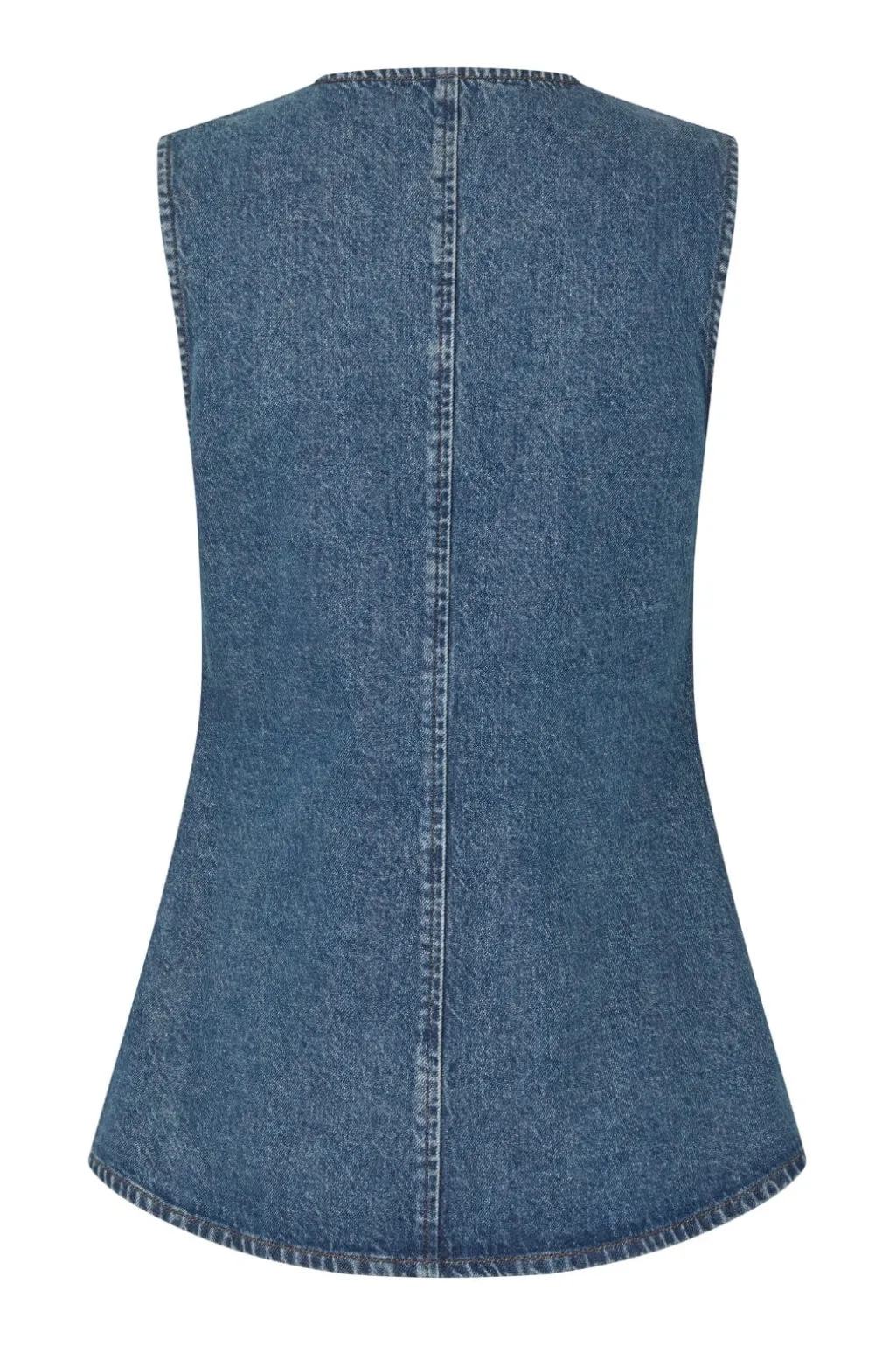 Ærmeløs denimvest fra Global Funk med rund hals. Vesten har en figursyet silhuet med dekorative syninger og hvide knapper foran.