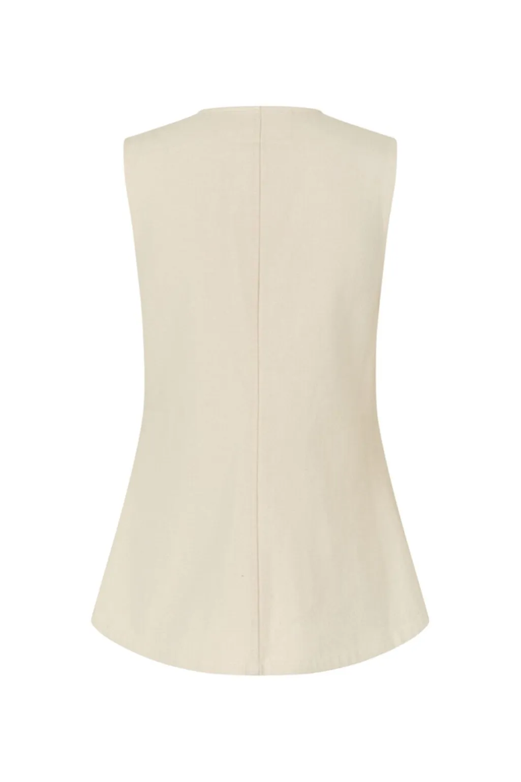 Ærmeløs vest fra Global Funk i en lys ecru-farve. Vesten har en rund hals, knapper foran og dekorative syninger, der giver et rent og enkelt udtryk.