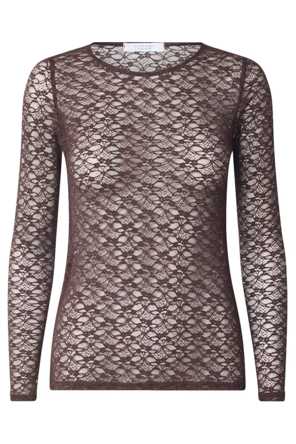 Langærmet bluse fra Sisters Point, lavet af gennemsigtig blonde i en mørk brun nuance. Blusen har et blomstermønster og en rund halsudskæring.