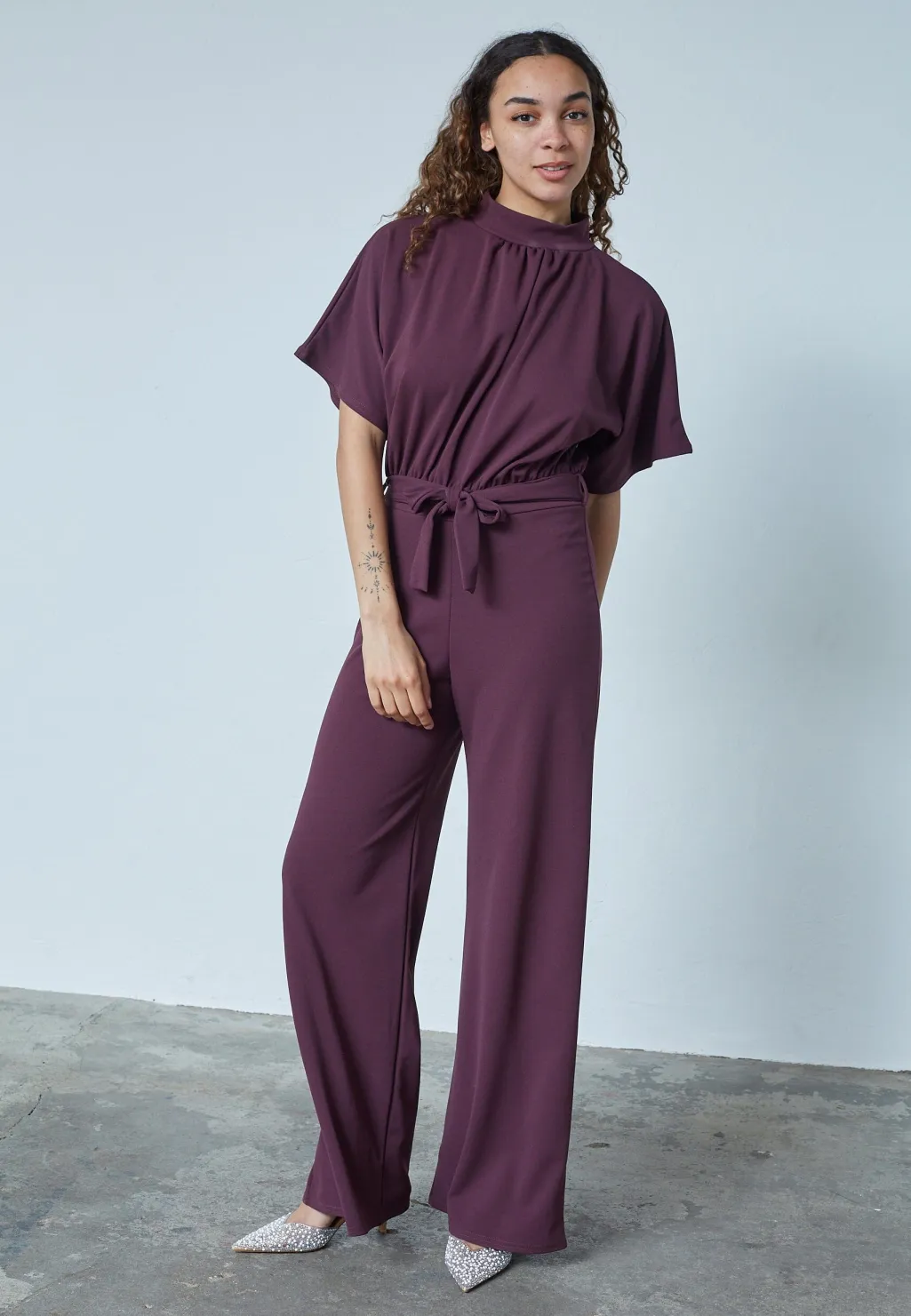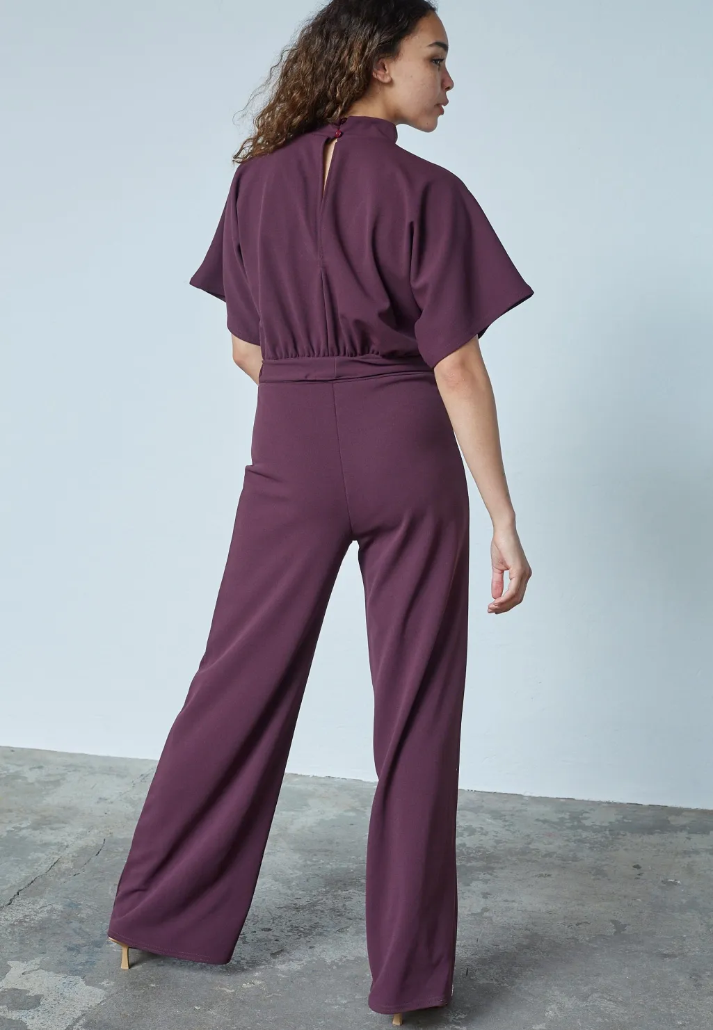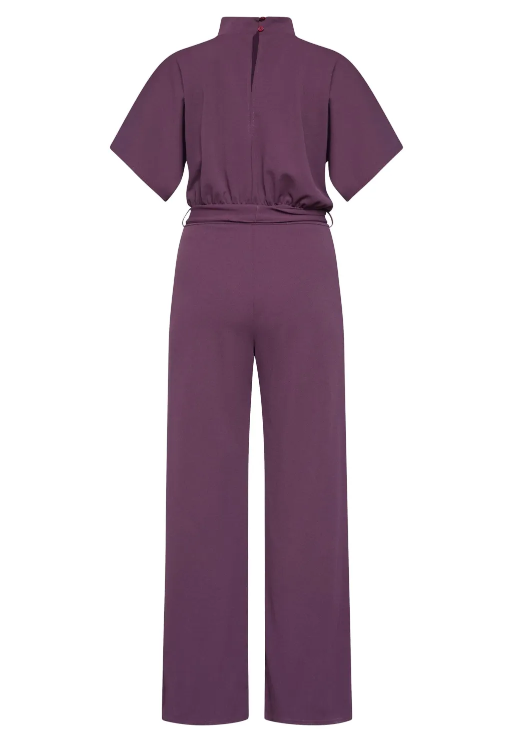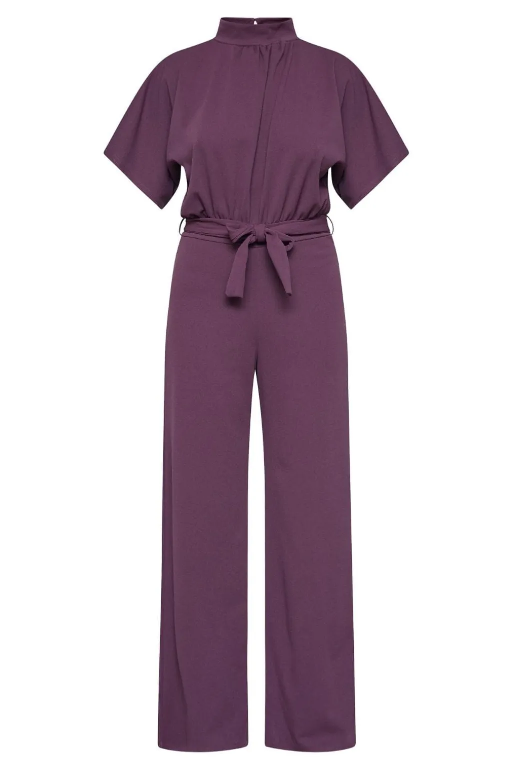 Jumpsuit fra Sisters Point i dyb bordeauxfarve. Buksedragten har en løs pasform med korte ærmer og en høj halsudskæring.