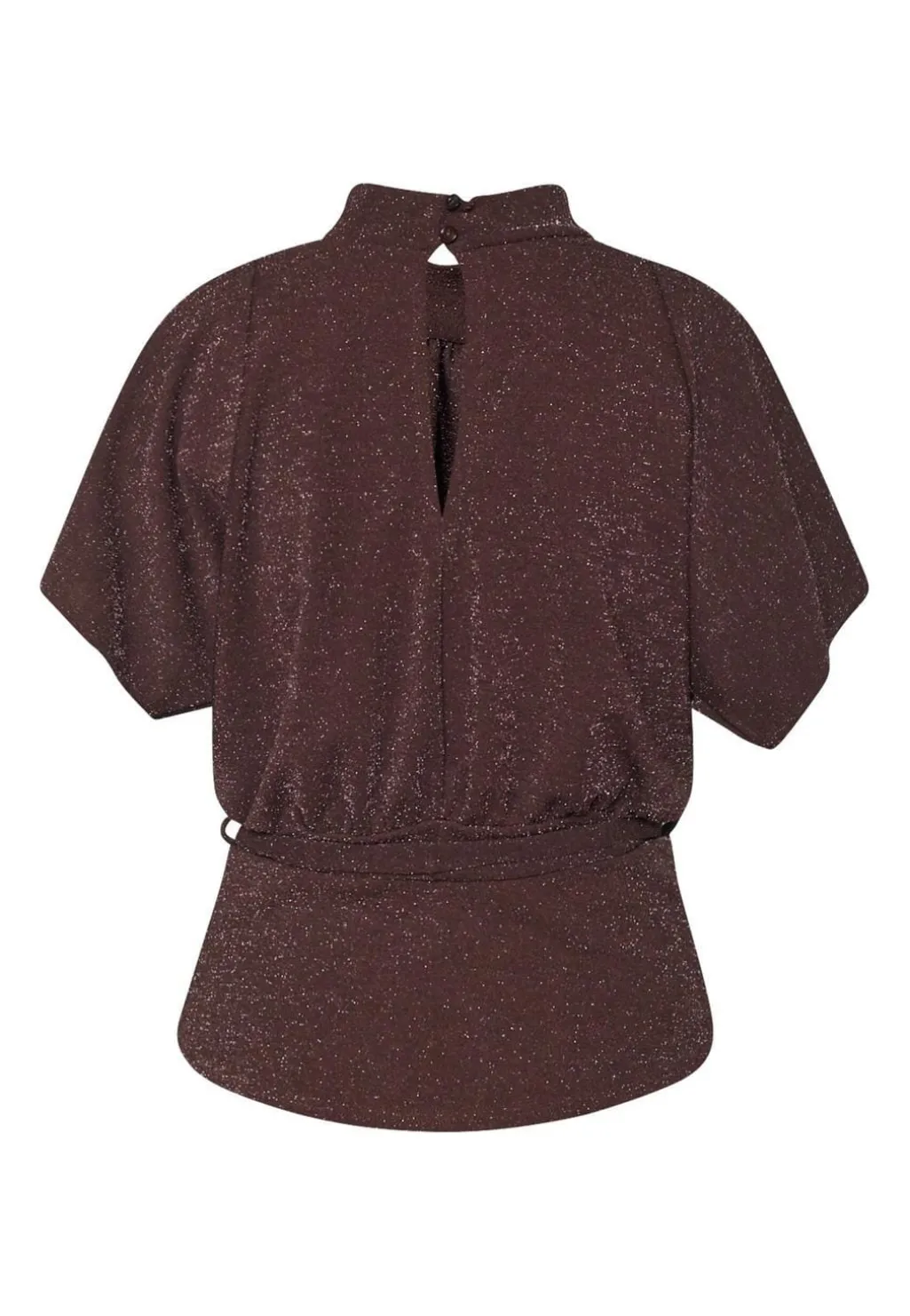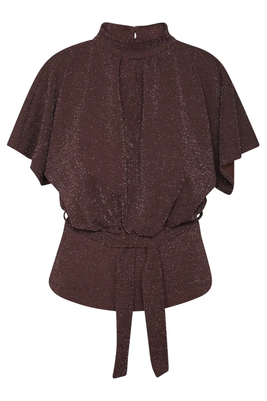 En brun top med sølvglimmer fra Sisters Point. Toppen har en høj hals, korte ærmer og et bindebånd i taljen.