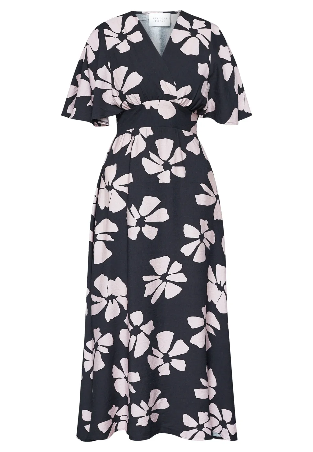 Kjole fra Sisters Point i sort med et lyserødt blomstermønster. Kjolen er lavet af 100 % polyester og har en ankellang længde.