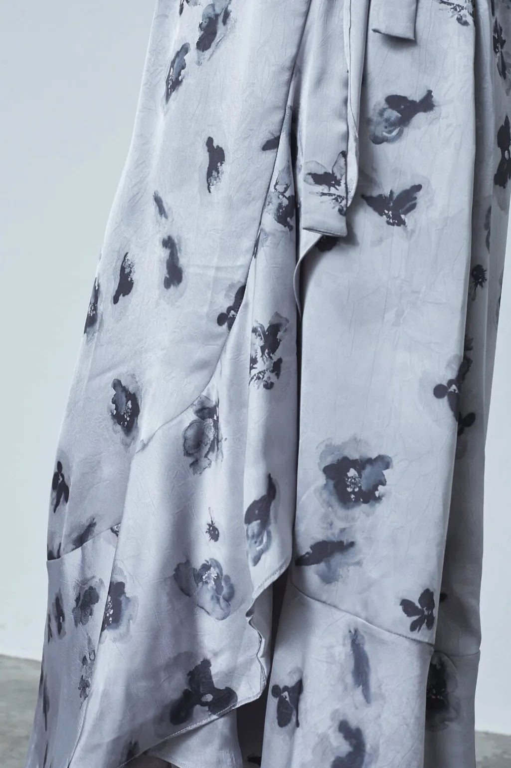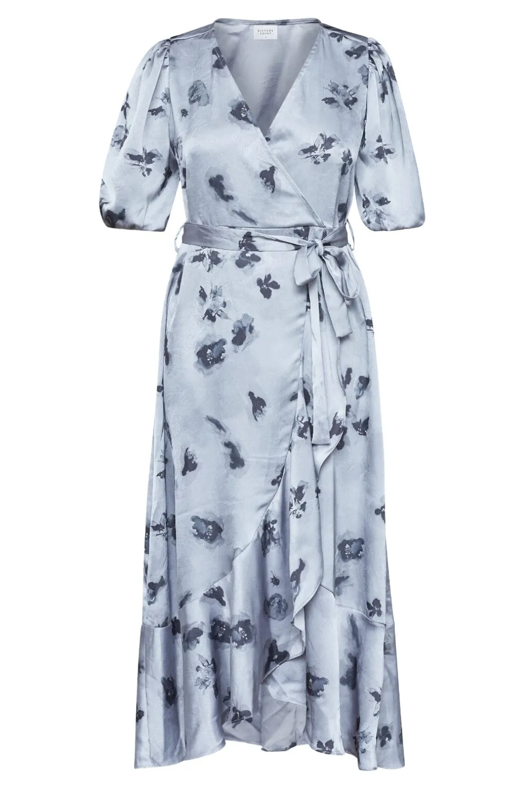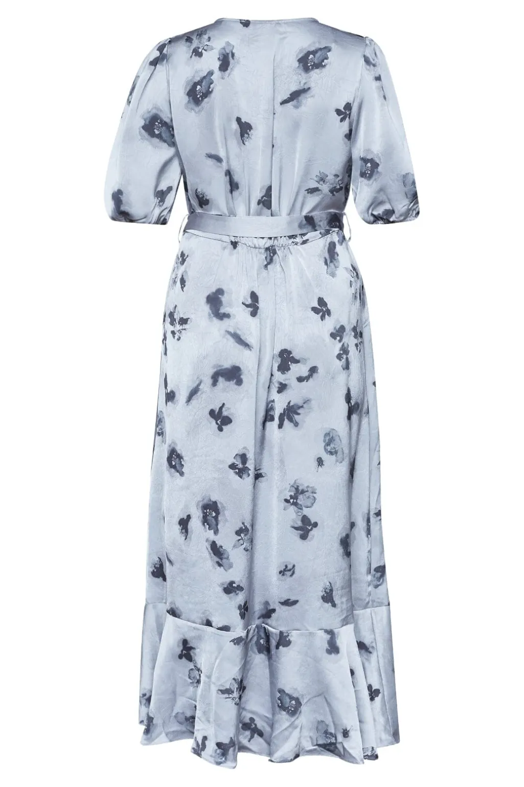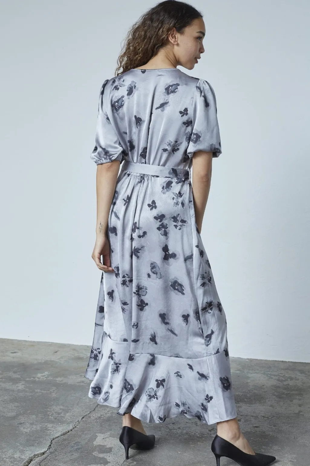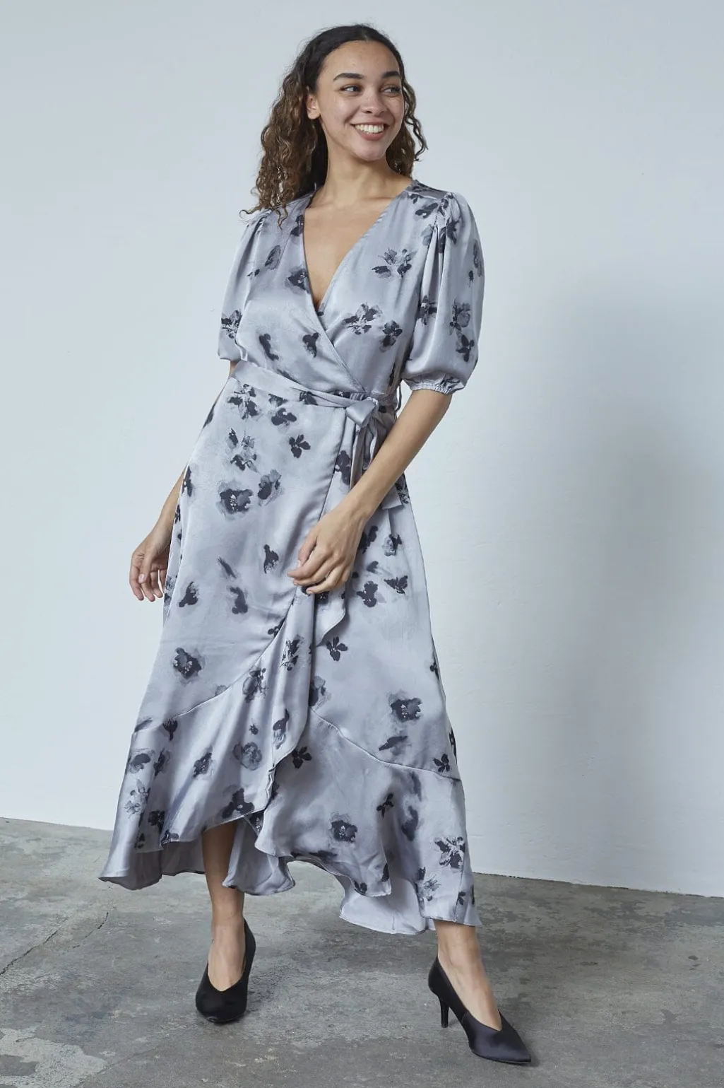 Lysegrå slå-om-kjole fra Sisters Point med blomstermønster i mørkere nuancer. Kjolen har korte pufærmer, v-udskæring og et asymmetrisk skørt med flæsedetaljer.