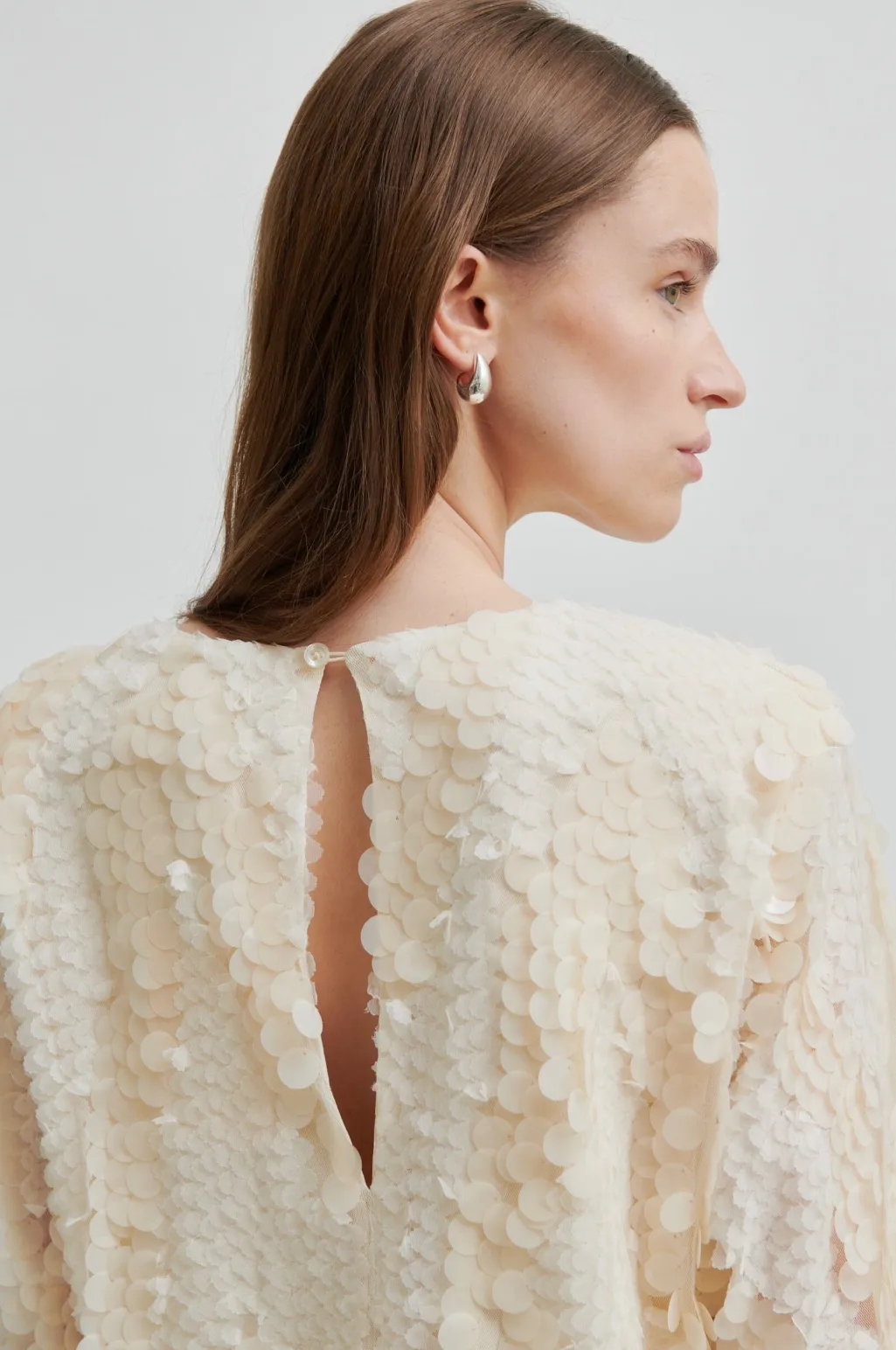 En bluse fra Second Female med pailletter i en lys cremefarvet nuance. Blusen er dækket af funklende pailletter på et transparent mesh-stof.