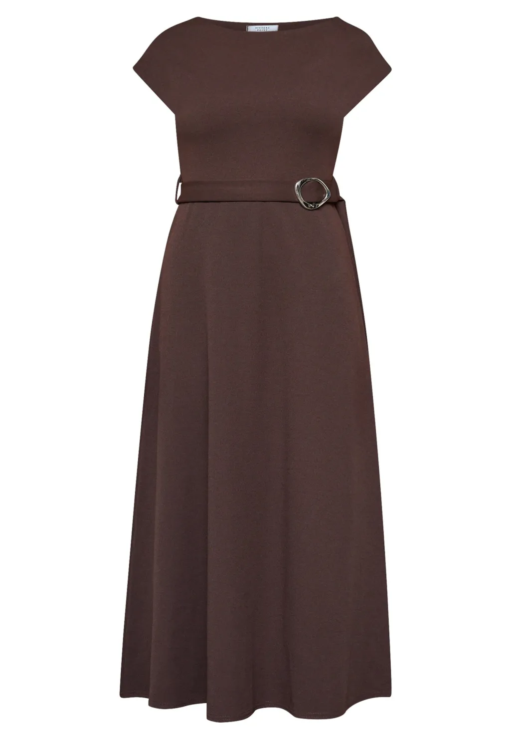 Mellemlang kjole fra Sisters Point i en dyb chokoladebrun farve. Kjolen er lavet af glat polyester, der falder tungt og giver en struktureret silhuet.