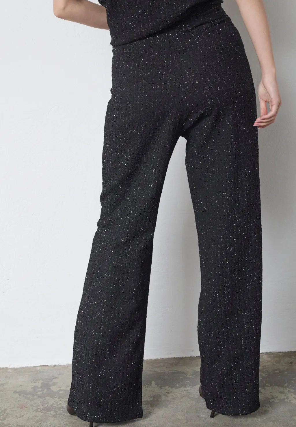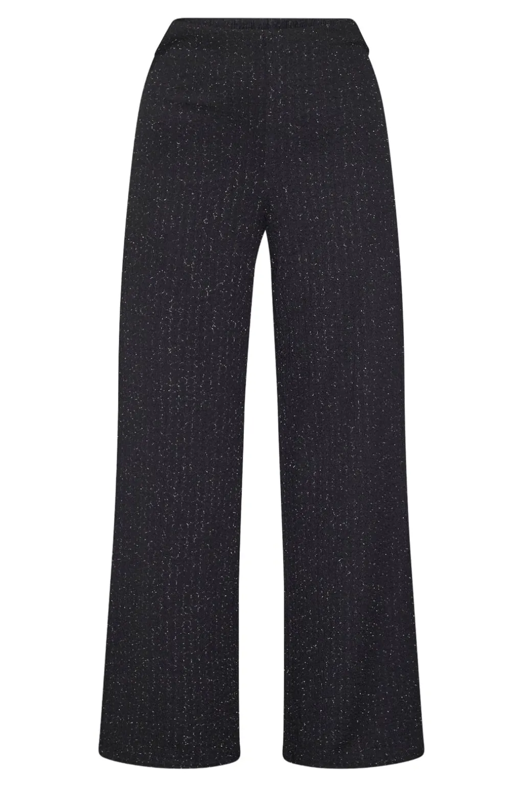 Sorte bukser fra Sisters Point med sølvfarvede, skinnende tråde. Bukserne har en gulvlang længde, høj talje og løs pasform med bred benvidde.
