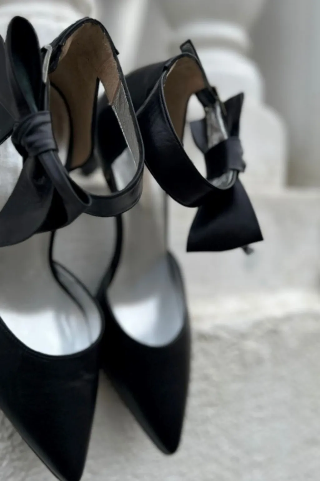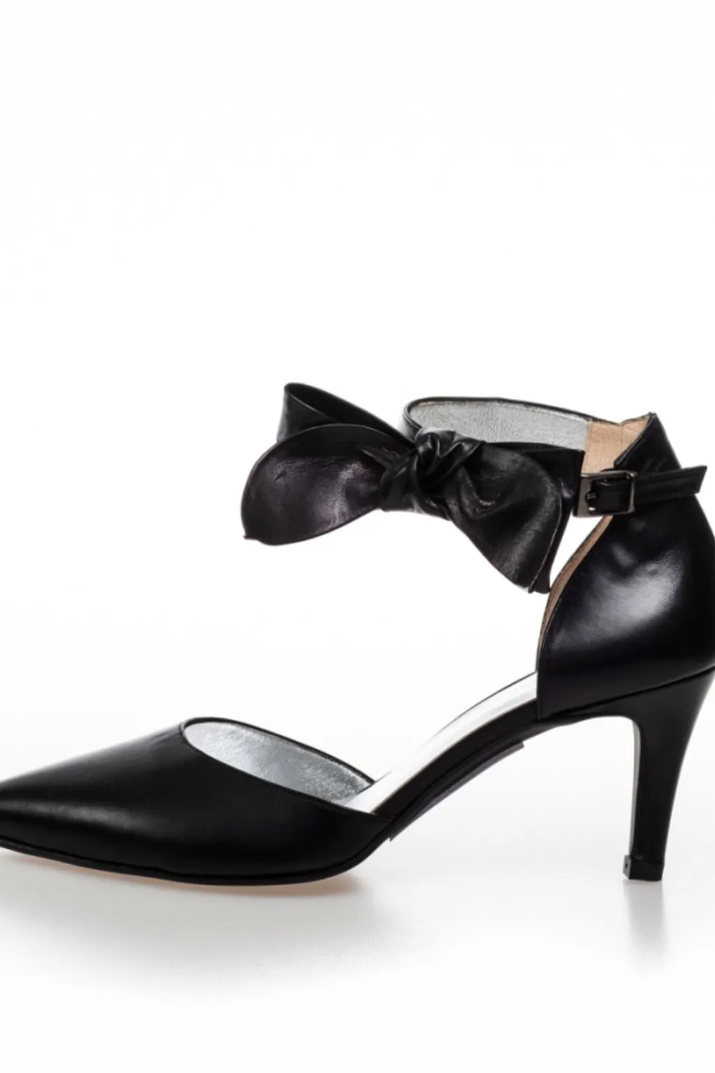 Sorte stiletter fra Copenhagen Shoes med spids tå og ankelrem. Skoen har en aftagelig sløjfe ved remmen og er lavet af blødt læder med stilethæl.
