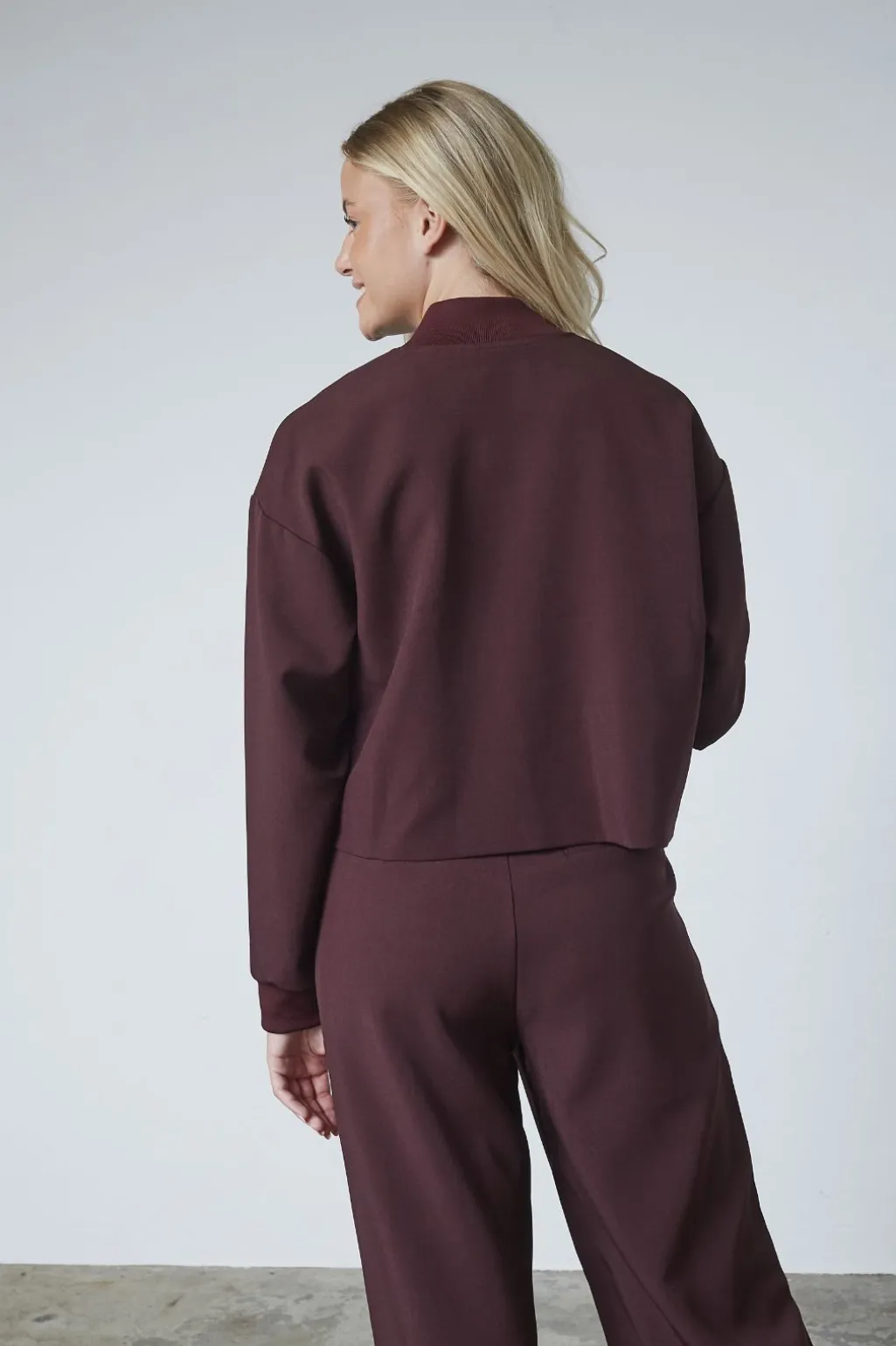 Kort jakke fra Sisters Point i mørk bordeauxfarve. Jakken har lange ærmer og en løs pasform, der giver bevægelsesfrihed til hverdagsbrug.