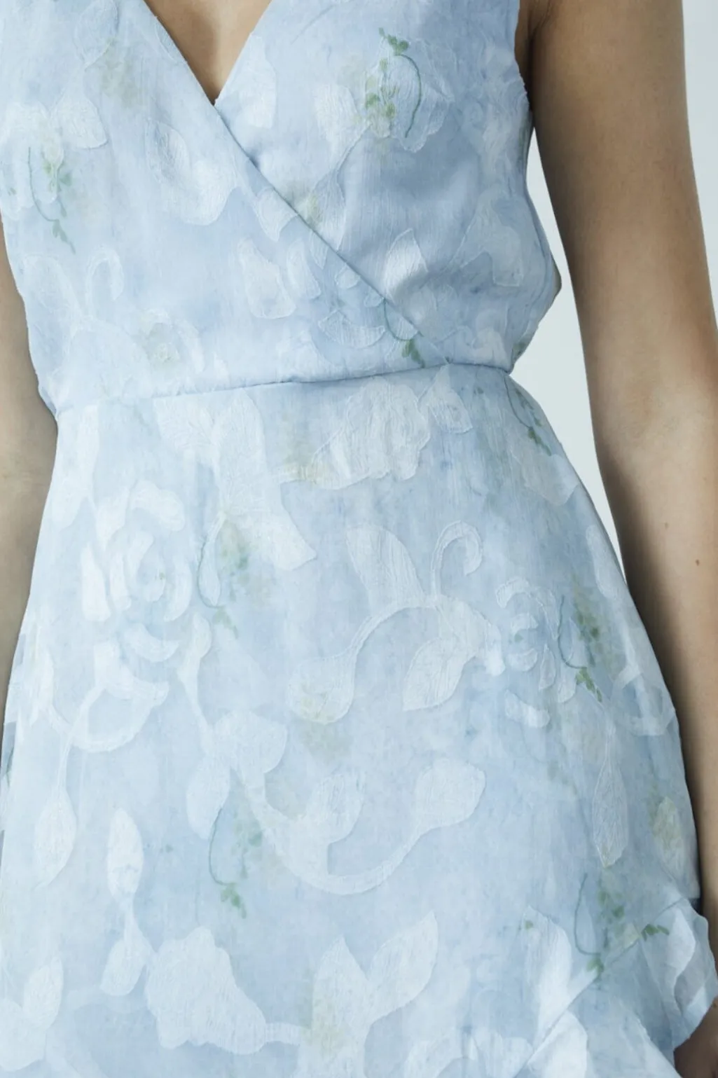 Lyseblå kjole fra Sisters Point med blomstermønster. Kjolen har en slå-om-effekt foran og et asymmetrisk skørt med flæsedetaljer. V-udskæringen og det ærmeløse design giver et let udtryk.