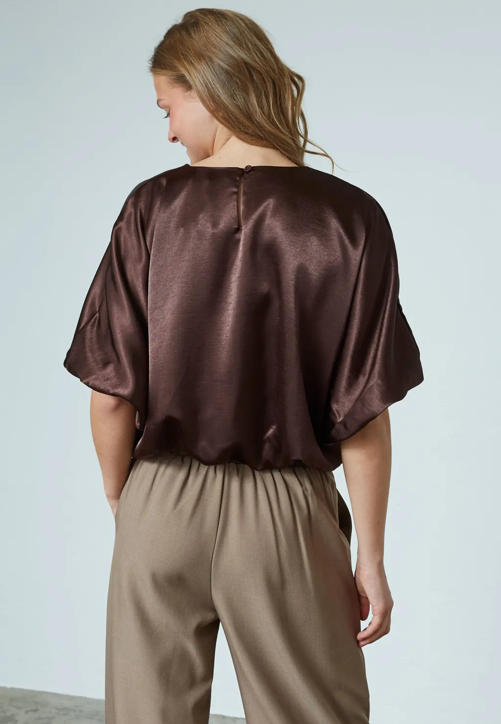 Top fra Sisters Point, lavet af skinnende brun polyester. Toppen har en løs pasform med korte, brede ærmer og en rund halsudskæring.