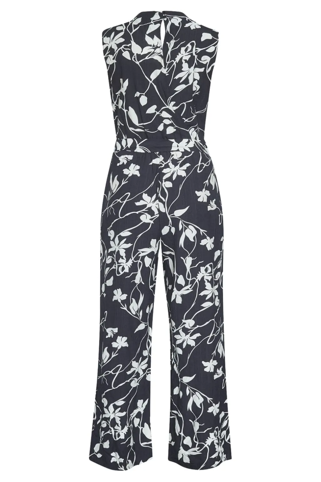 Sort buksedragt fra Sisters Point med hvidt blomstermønster. Den ærmeløse model har høj hals og bindebånd i taljen. Designet er i ankellængde med løs pasform.