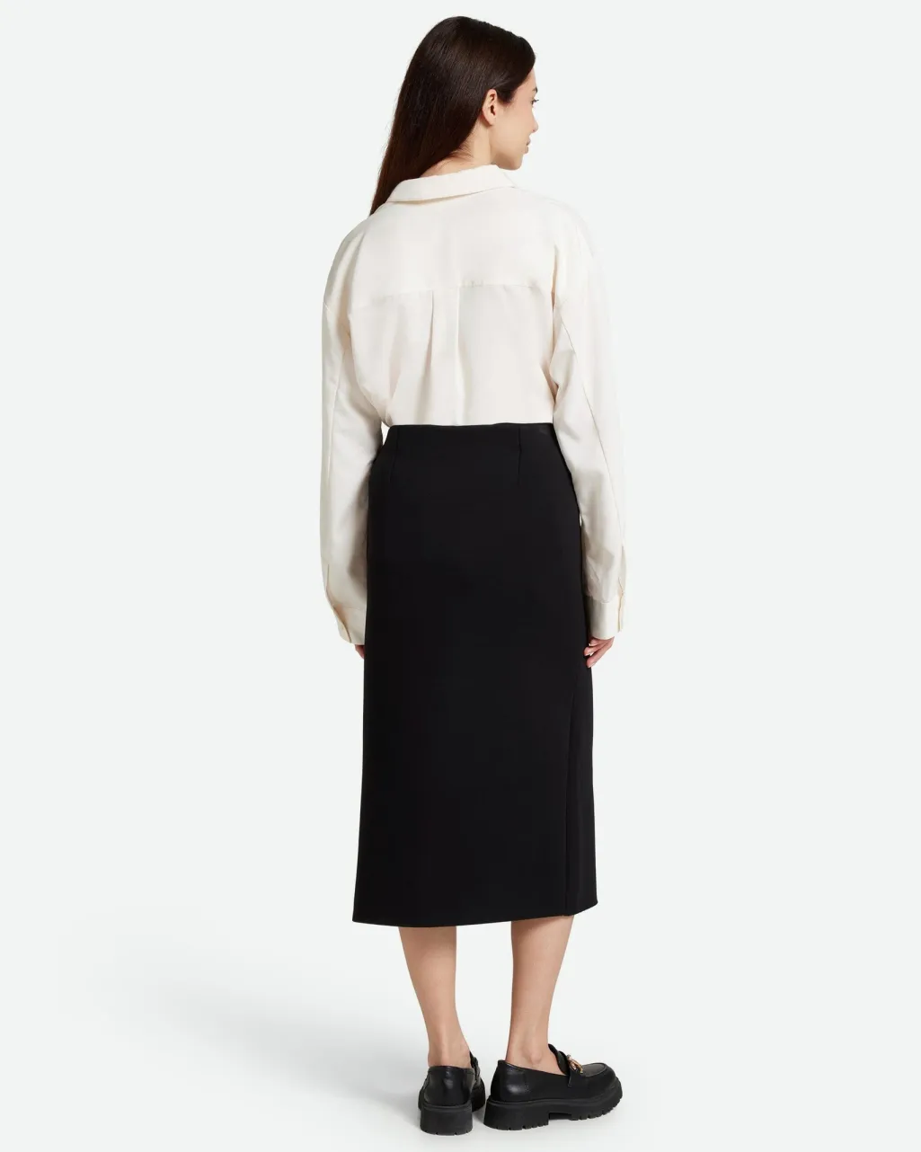 Sort nederdel fra Moves By Minimum i kalvelængde med lige silhuet og frontslid. Den enkle stil passer til både kontoret og festlige lejligheder.