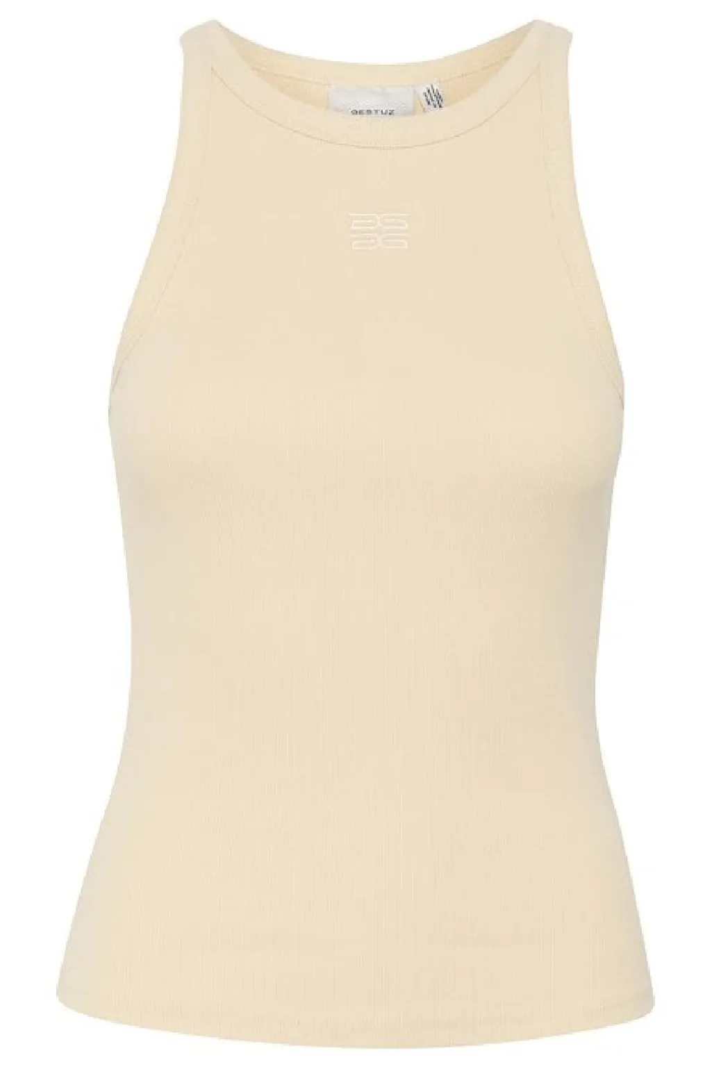 Smørgul tanktop fra Gestuz med ribbet tekstur og broderet logo. Den har en rund halsudskæring og er lavet i en blød bomuldsblanding med stretch, der gør den velegnet til både hverdag og træning.