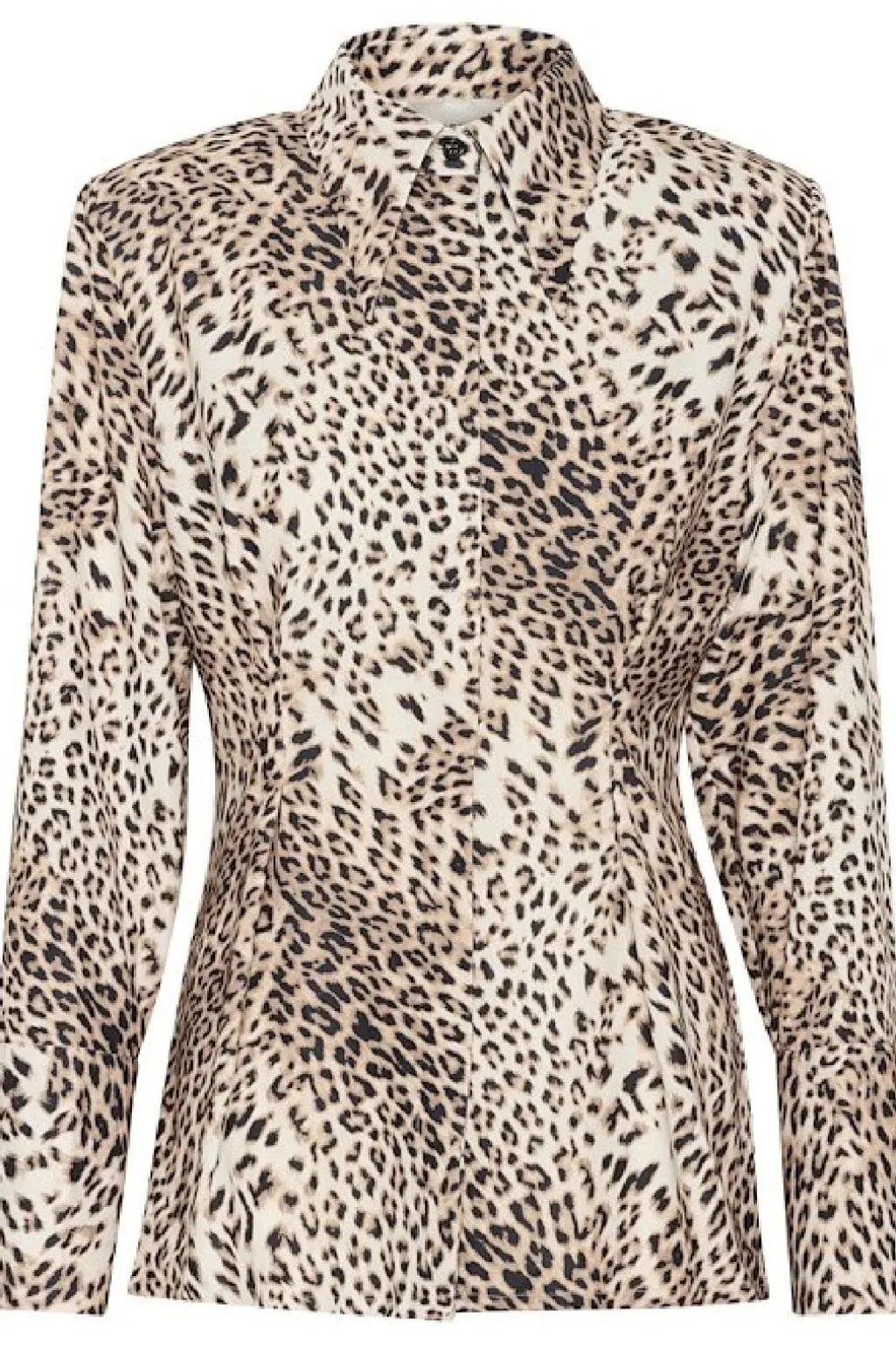 Skjorte fra Gestuz med leopardmønster i creme- og hvide nuancer. Skjorten har en klassisk krave, knaplukning og lange ærmer.