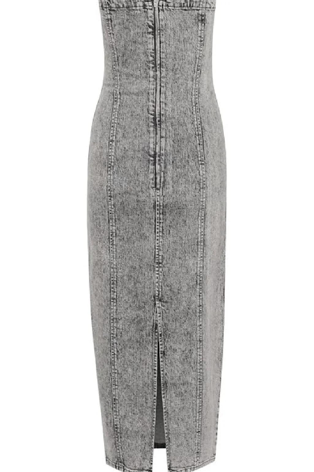 Lang kjole fra Gestuz i vintage grå vask. Kjolen har et stropløst design med off-shoulder udskæring og ankellængde, hvilket giver den et rent og enkelt udtryk.
