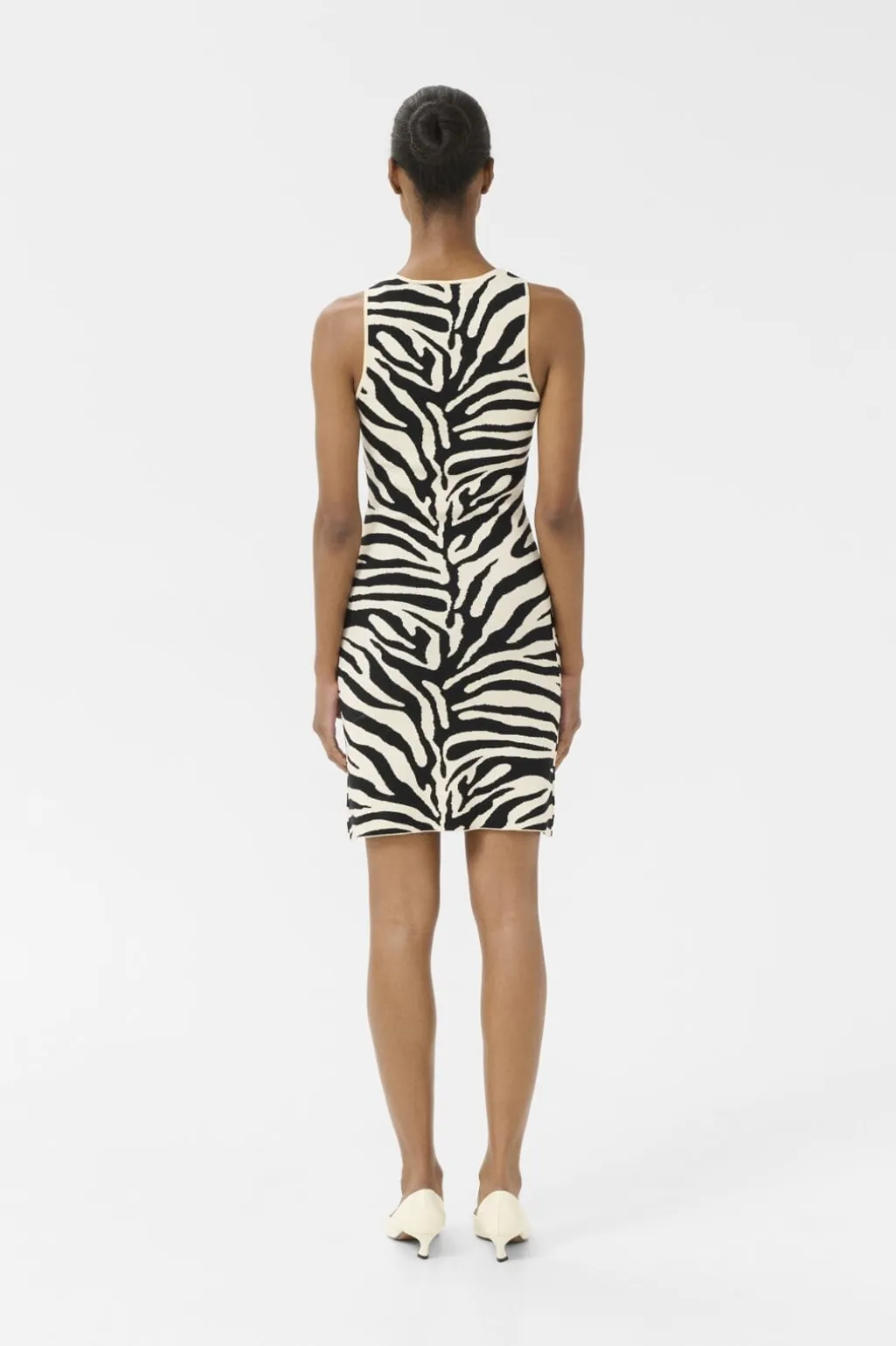 Ærmeløs kjole fra Gestuz med zebraprint i sort og birch. Den har en rund halsudskæring og en lige silhuet, der går til midt på låret.