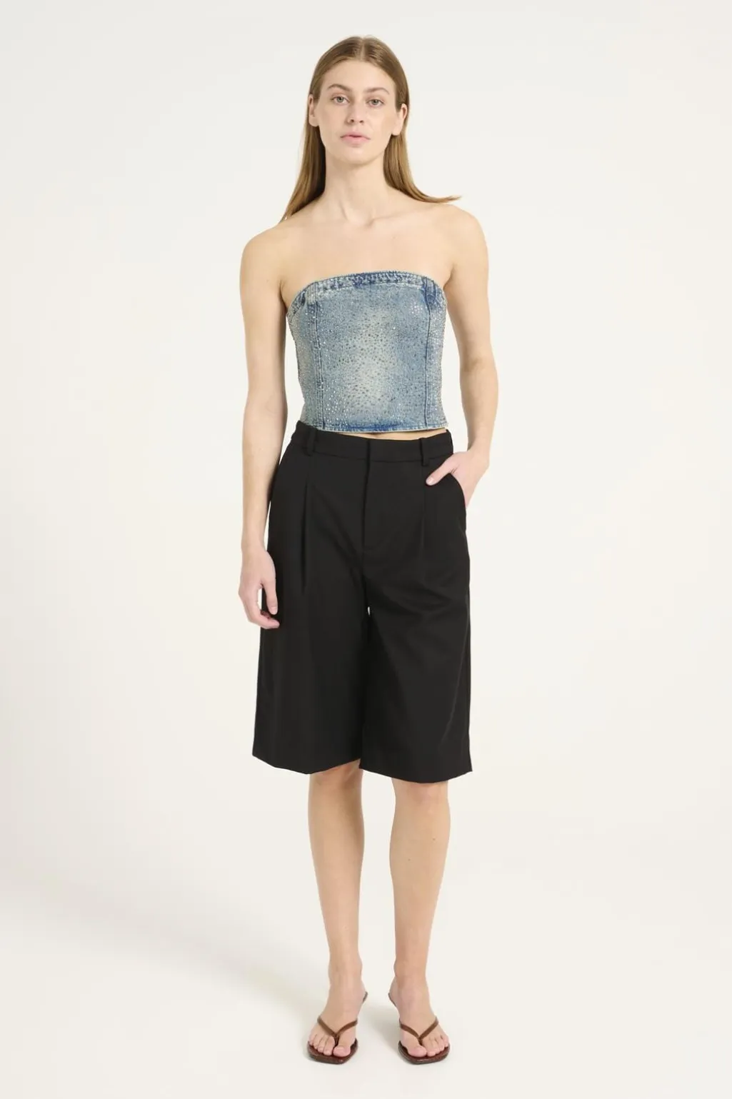 Denimcorsage fra Gestuz i lysblå acid wash. Den stropløse top har pailletter og flæser, som giver den et festligt udtryk. Designet til særlige anledninger med en kombination af rå denim og glimtende detaljer.