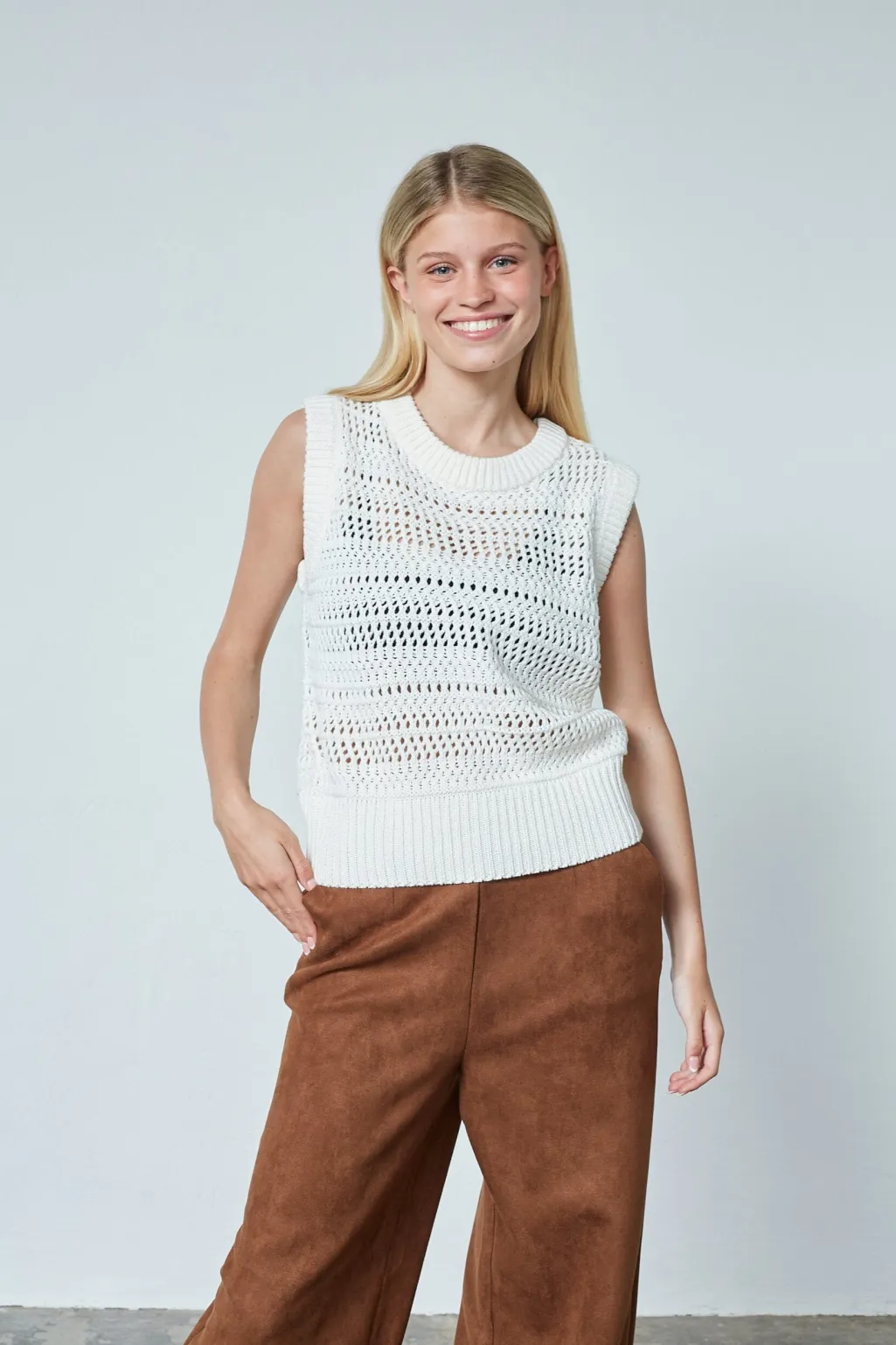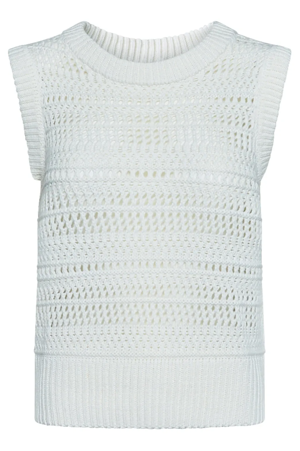Cremefarvet strikvest fra Sisters Point med et åbent hulmønsterdesign gennem hele toppen. Vesten har en rund halsudskæring og ribbet kant ved halsudskæringen og forneden.