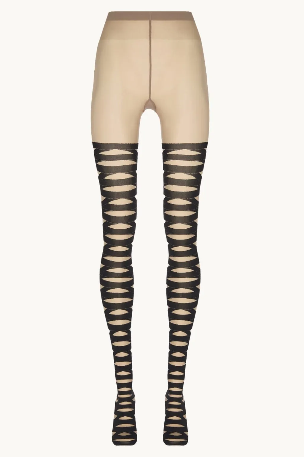 Strømpebukser fra Wolford med nude overdel og sortstribet mønster på benene. De vandrette striber skaber et grafisk udtryk, mens den nude del giver et naturligt look.