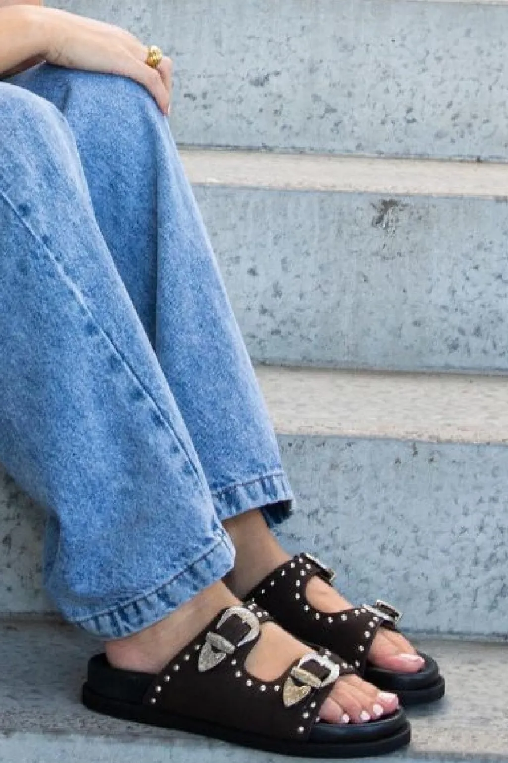Mørkebrun sandal fra Copenhagen Shoes i ruskind med to spænder og nitter langs kanten. Sandalen har en flad sål og åben tå.