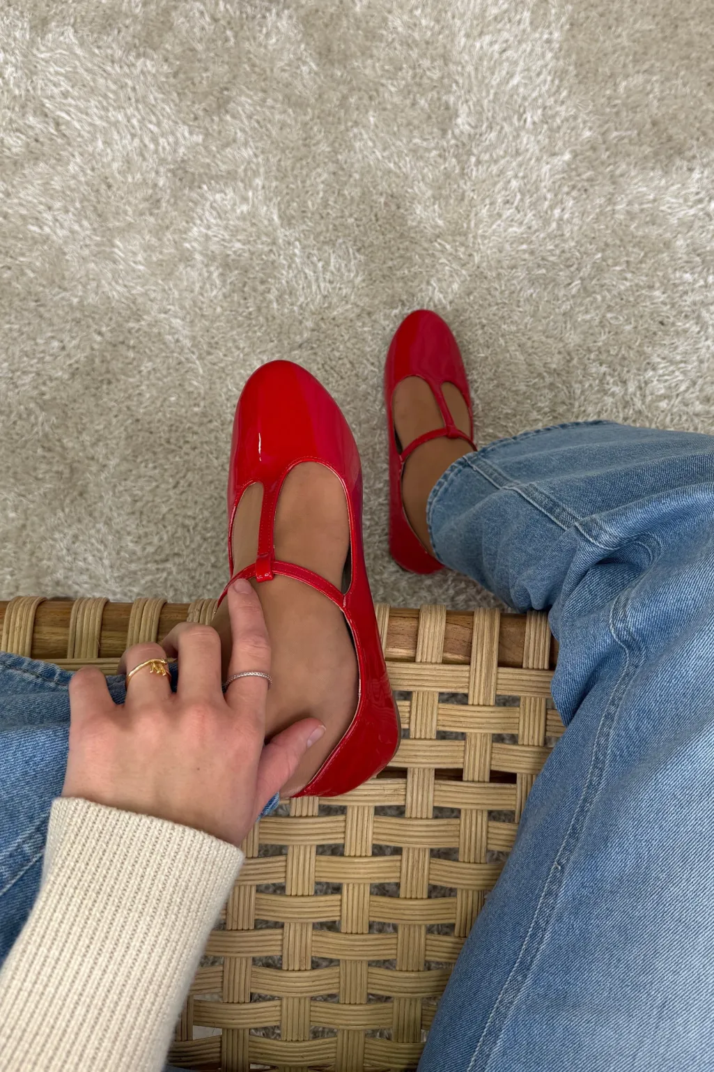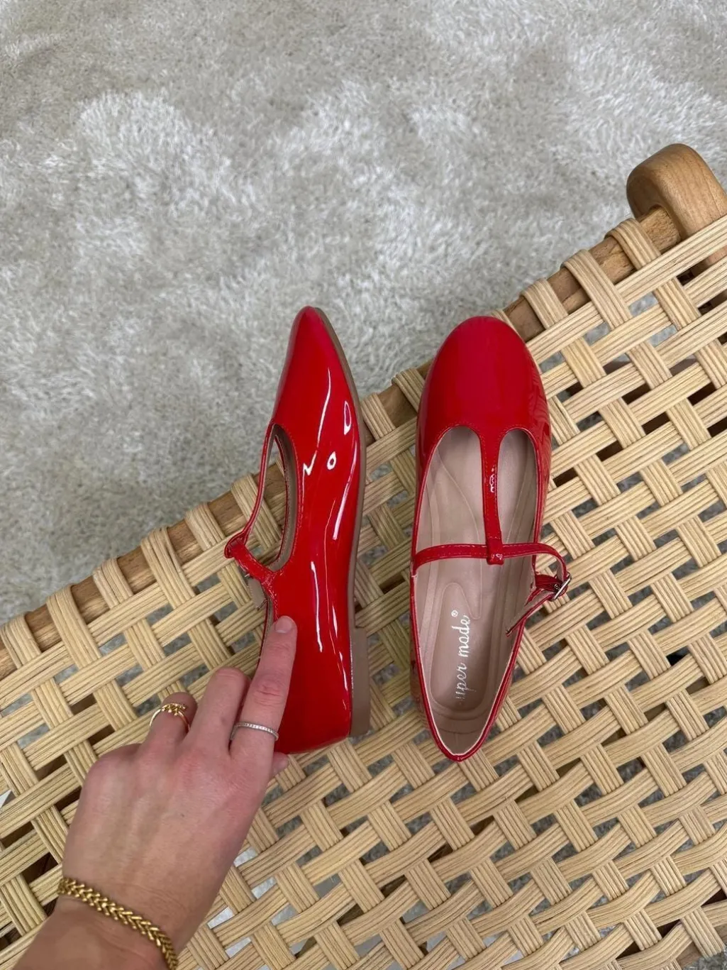 Rød sko fra Bloom med blank overflade. Den firkantede tå og knapperne på remmen giver skoen et særligt design. Den flade hæl gør skoen behagelig at gå i.
