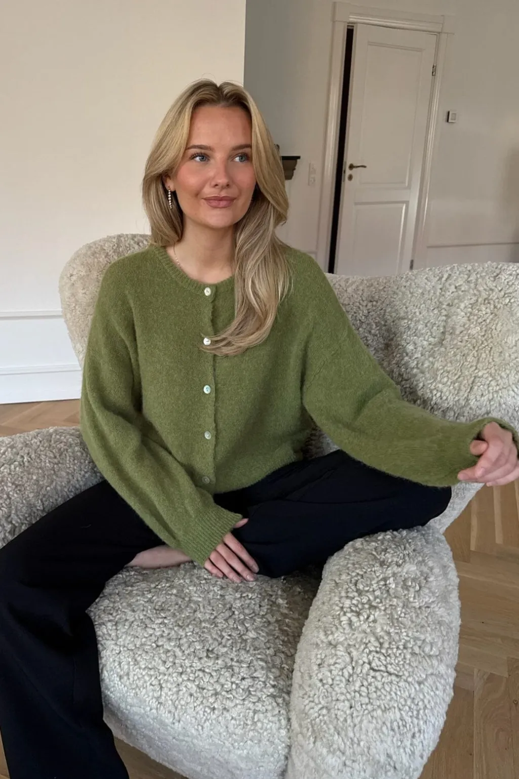 Olivengrøn cardigan med rund hals og knaplukning. De brede ærmer og perlemorsknapperne giver cardiganen et rent og enkelt design.