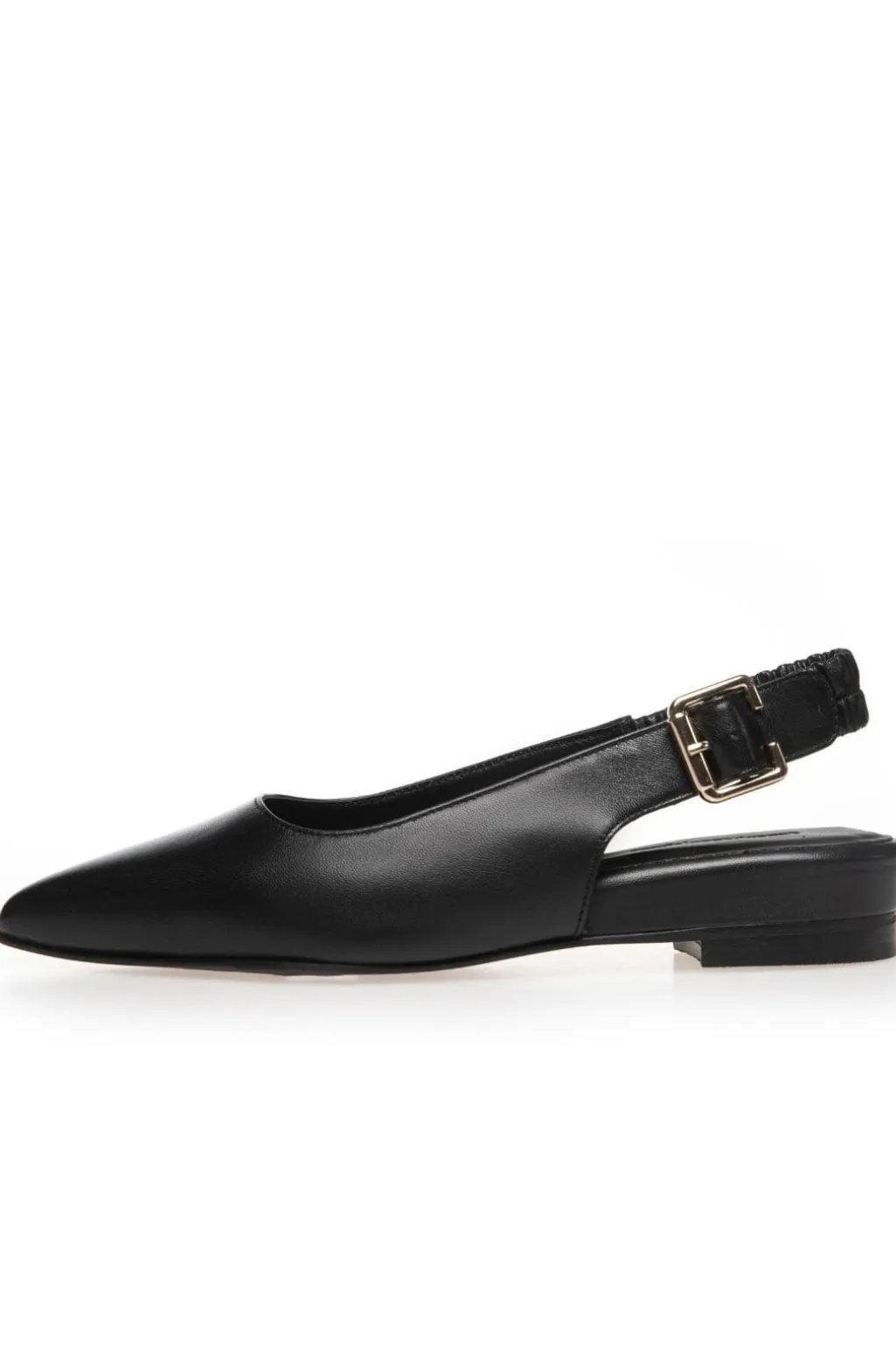 Sorte slingback-sko fra Copenhagen Shoes i læder med spids tå. Skoene har spændelukning i hælen og en lav hæl, der gør dem praktiske til mange anledninger.