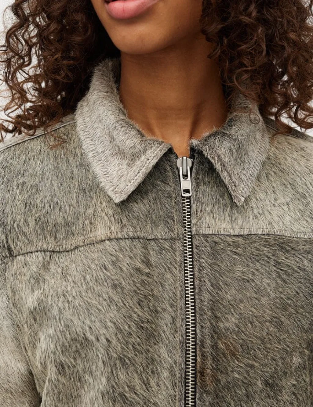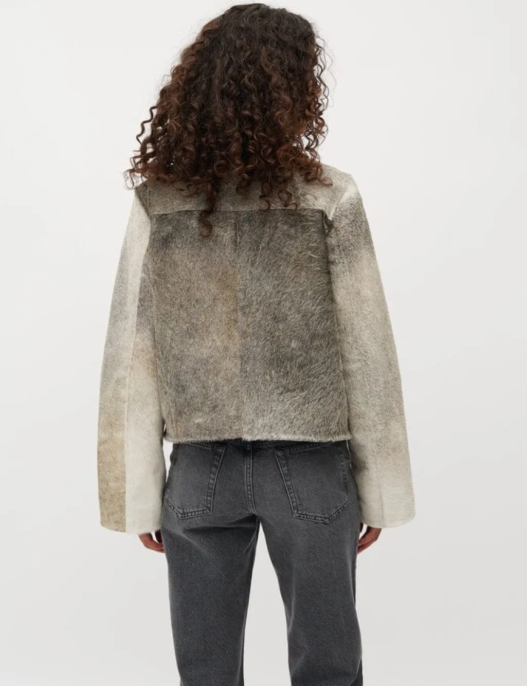 Jakke fra MbyM, lavet af koskind i en grå nuance med dyreprint. Jakken har en lynlås foran og dekorative syninger.