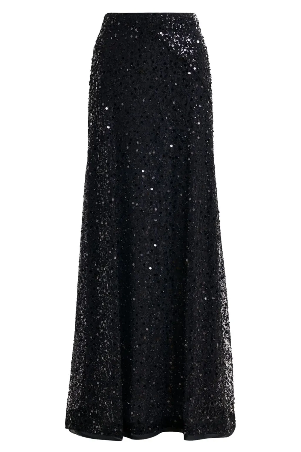 Sort maxinederdel fra Essentiel Antwerp med fuld pailletdækning. Nederdelen har en høj talje og et let flared design mod bunden.