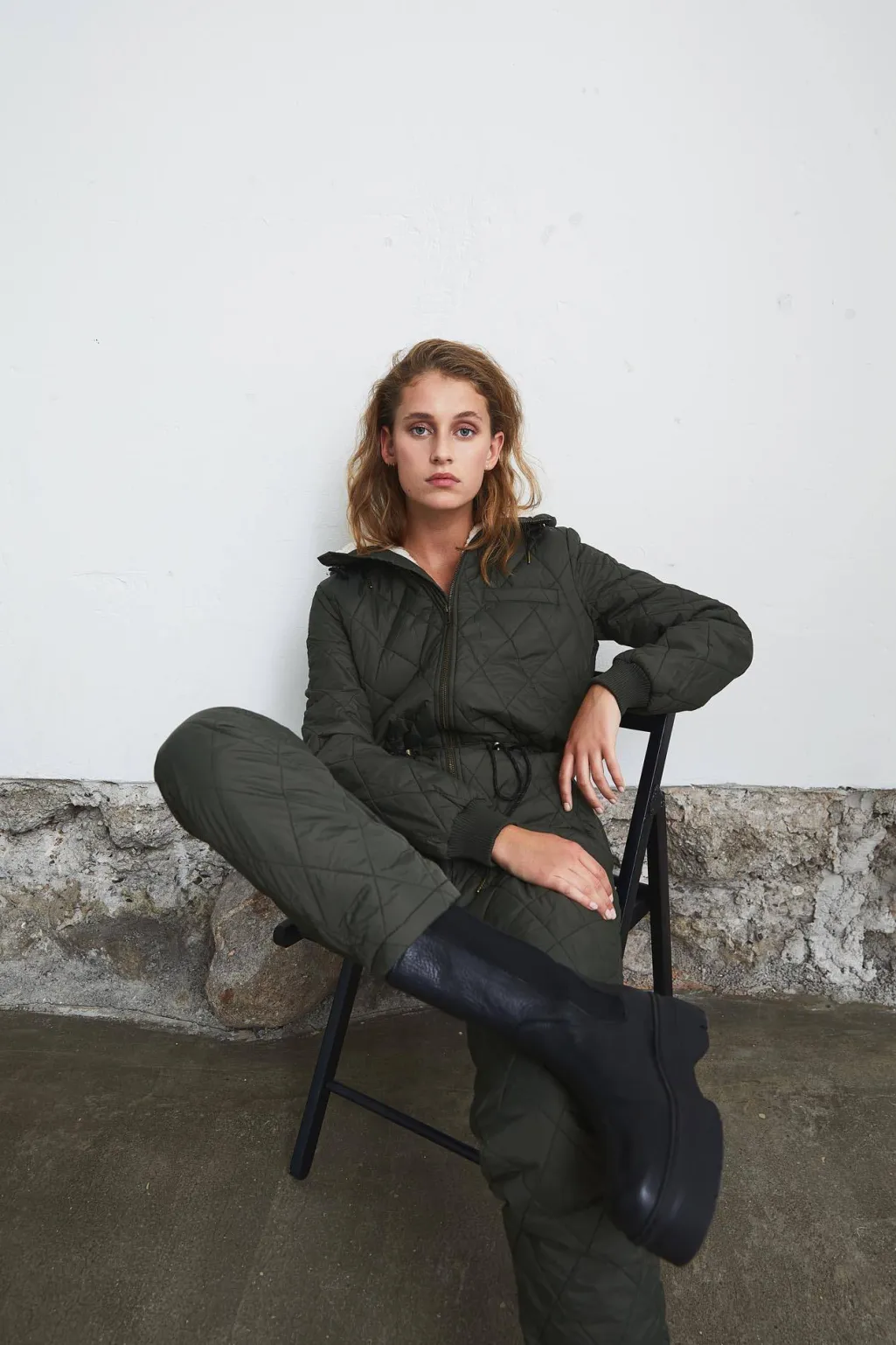 Super lækker termodragt til kvinder fra Global Funk. I taljen er der elastik og snor som kan strammes ind. Dragten har et lækkert teddy foer, samt en hue som også kan spændes ind. Dragten har ribkant ved ærmerne. Perfekt til vinter, har almindelig polyester foer i ben og ærmer. Og teddy/pile foer i overkrop og hætte.