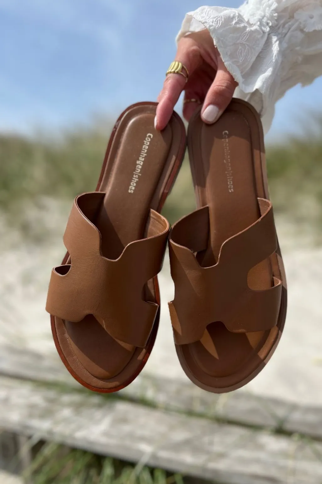 Lædersandal fra Copenhagen Shoes i en varm cognacfarve. Sandalen har en åben tå og er lavet med udskæringer på stropperne, der giver en luftig fornemmelse på foden.