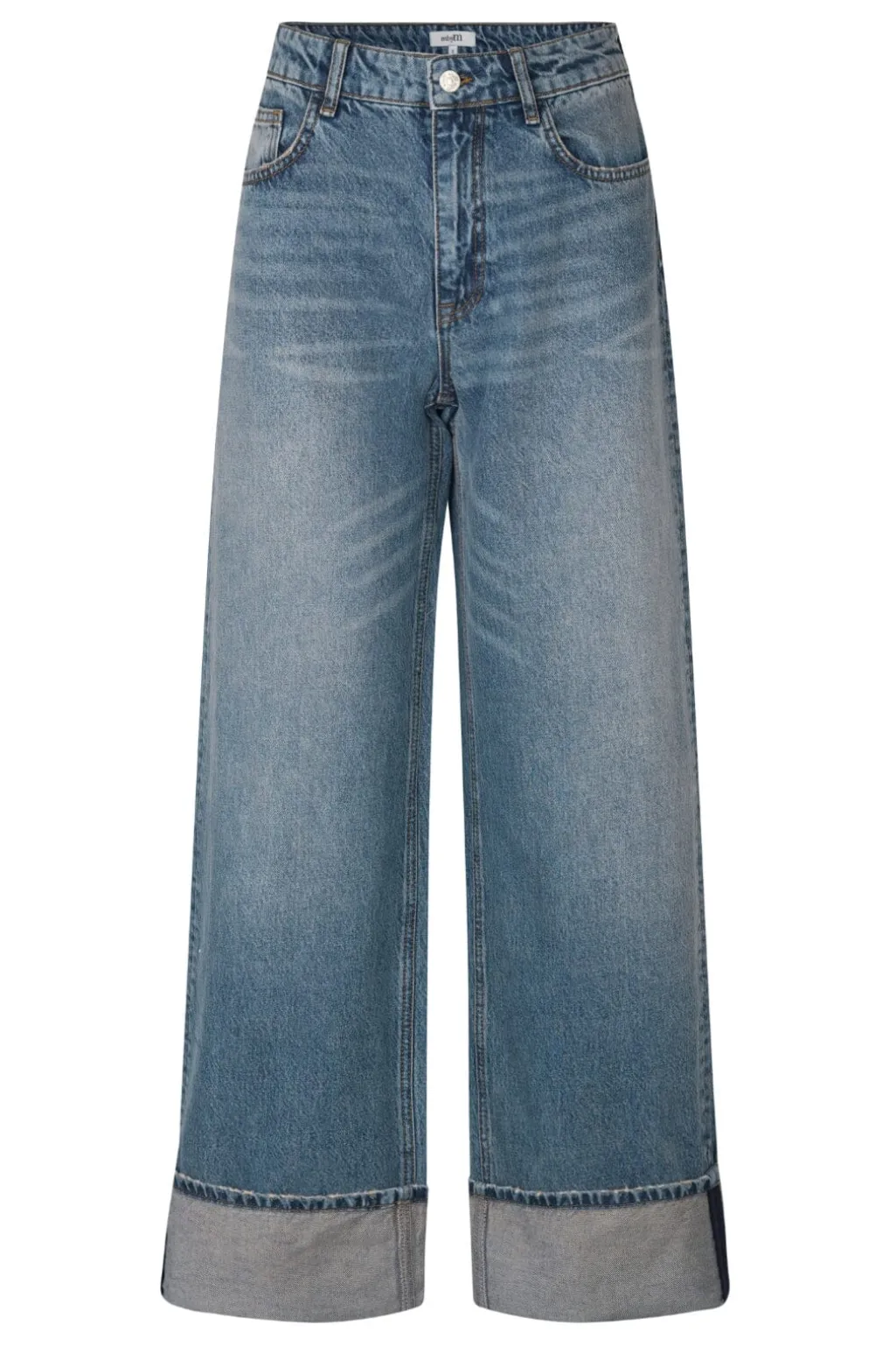 Jeans fra MbyM i en vasket blå farve. Jeansene har en bred benform med foldet kant nederst på benene.