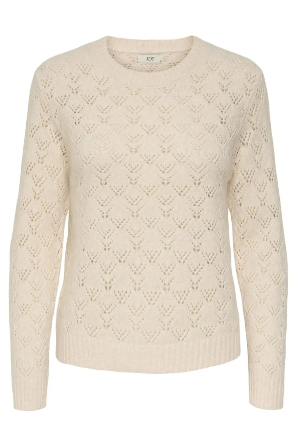 Striktrøje fra JDY i en lys grå-beige nuance. Trøjen har et åbent strikmønster med dekorative syninger og ribkanter ved halsen, ærmerne og bunden.
