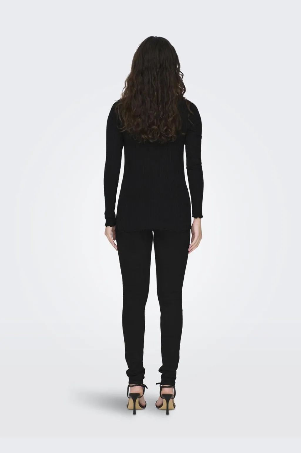 Sort top fra JDY med høj hals og lange ærmer. Toppen har en ribstrikket struktur og flæsekanter ved halsen og ærmerne, der giver et feminint præg.