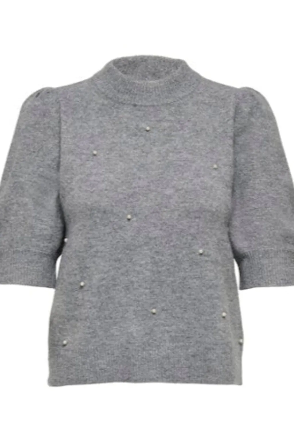 Grå meleret pullover fra JDY med hvide perler på forsiden. Pulloveren har korte ærmer og en høj hals.
