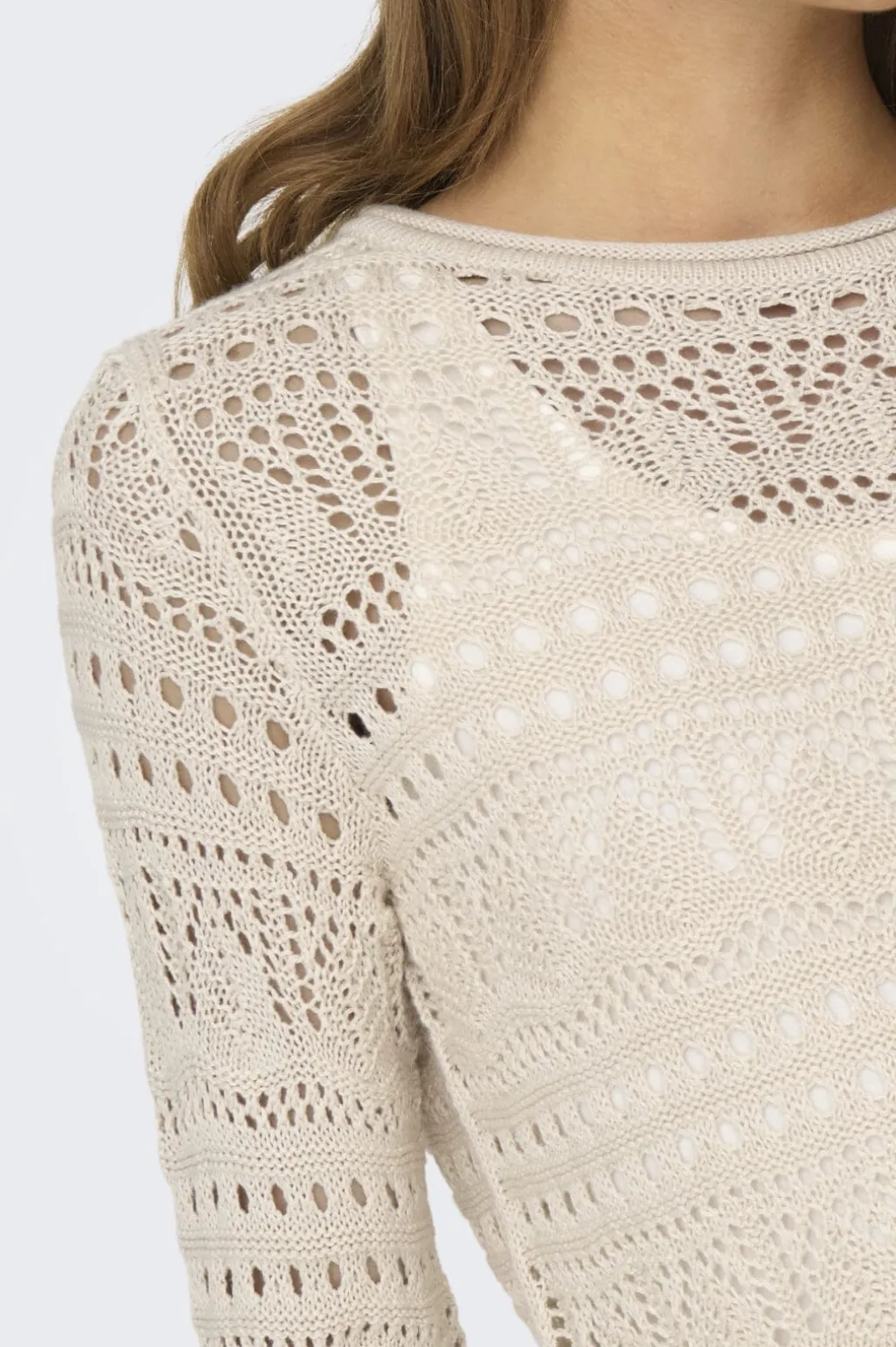 Striktrøje fra JDY i en lys tapiocafarve. Trøjen har strukturstrik og muslingedetaljer gennem hele designet, der skaber et fint mønster i strikken.