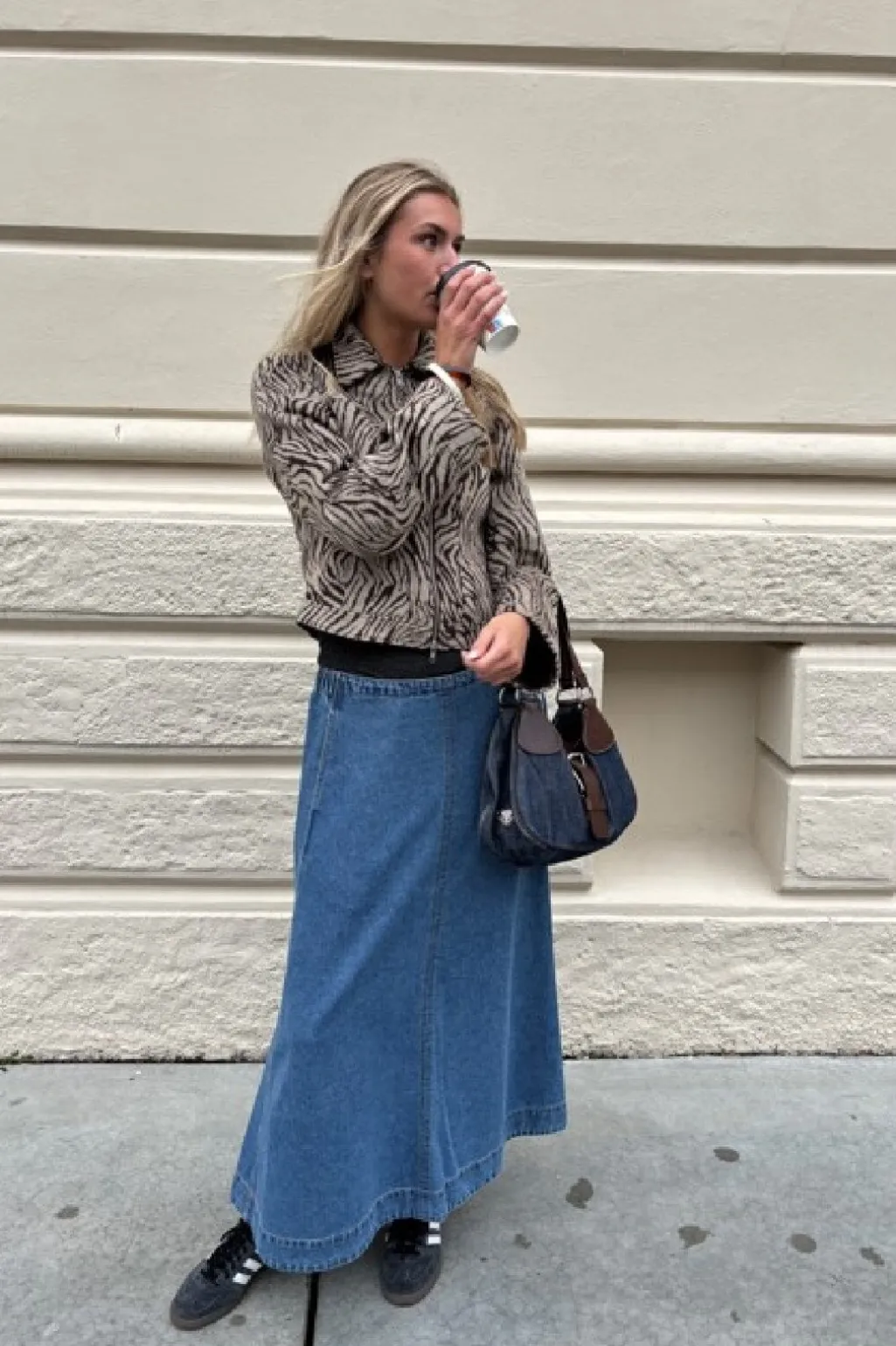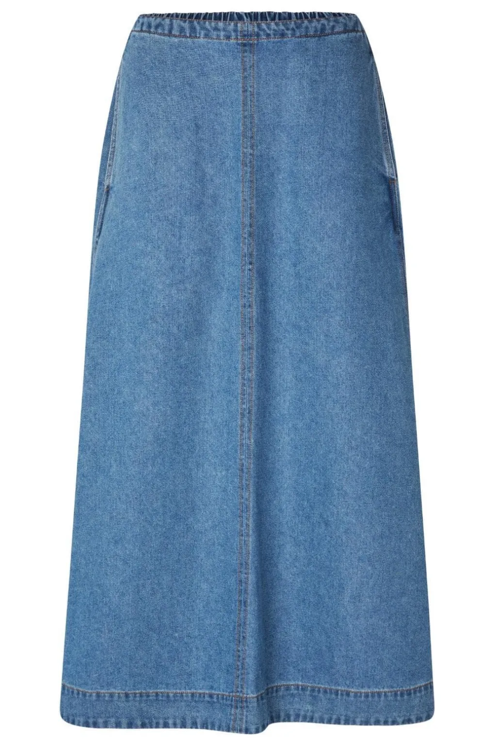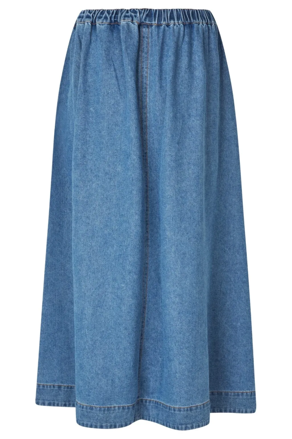Lang denimnederdel fra Global Funk i en mellemblå vintagefarve. Nederdelen har en klassisk pasform og går til anklerne. Sidelommerne giver nederdelen et praktisk præg.