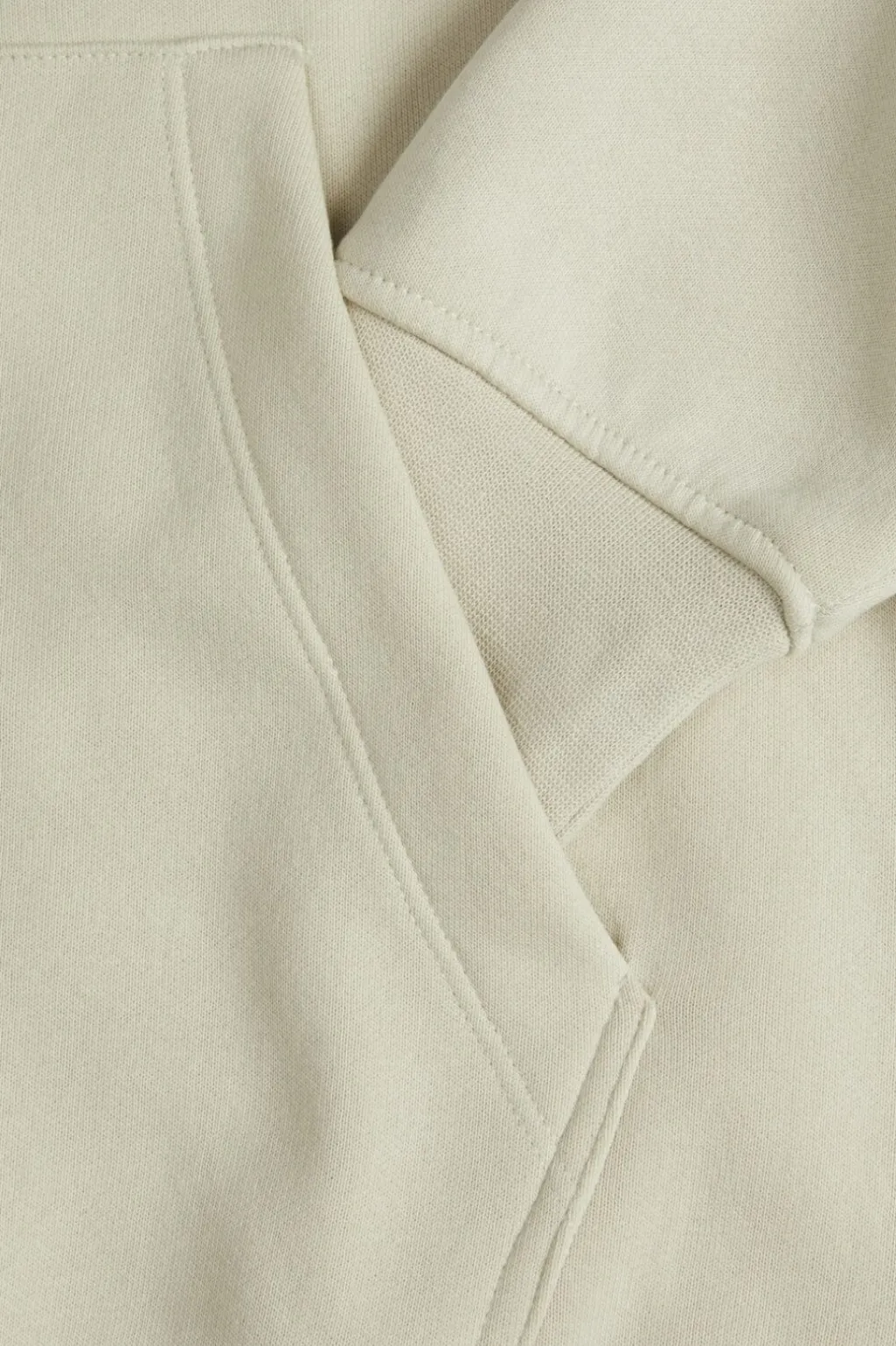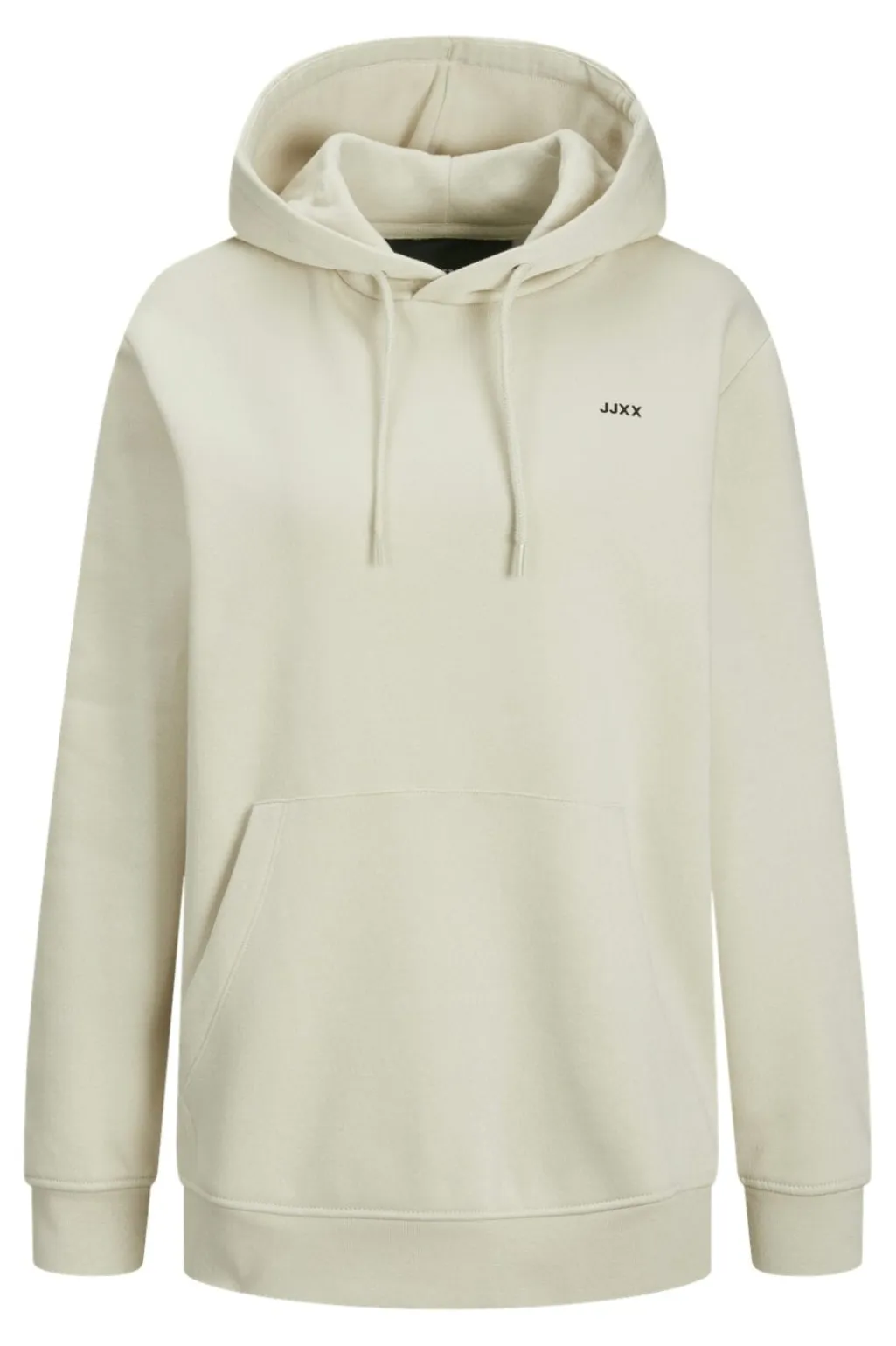 Beige hættetrøje fra Jjxx med broderet logo på forsiden. Den har en løs pasform og kængurulomme foran.